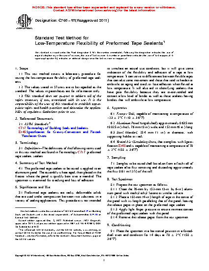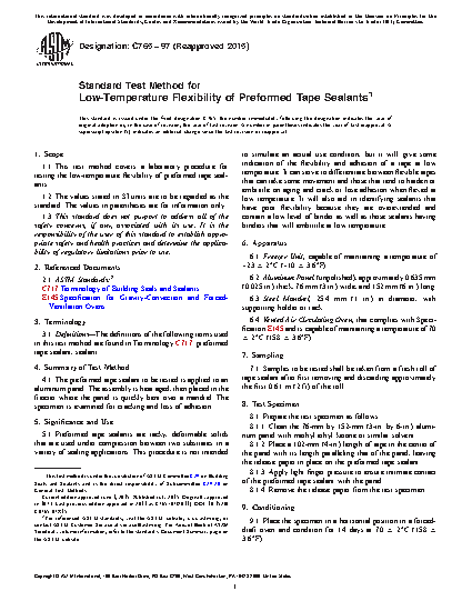 Preformed tape sealants are tacky, deformable solids that are used under compression between two substrates in a variety of sealing applications. This procedure is not intended to simulate an actual use condition, but it will give some indication of the flexibility and adhesion of a tape at low temperature. It can serve to differentiate between flexible tapes that can take some movement and those that tend to harden or embrittle on aging and crack or lose adhesion when flexed at low temperature. It will also aid in identifying sealants that have poor flexibility because they are overextended and contain a low level of binder as well as those sealants having binders that will embrittle at low temperature.
