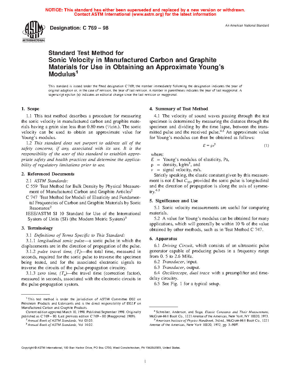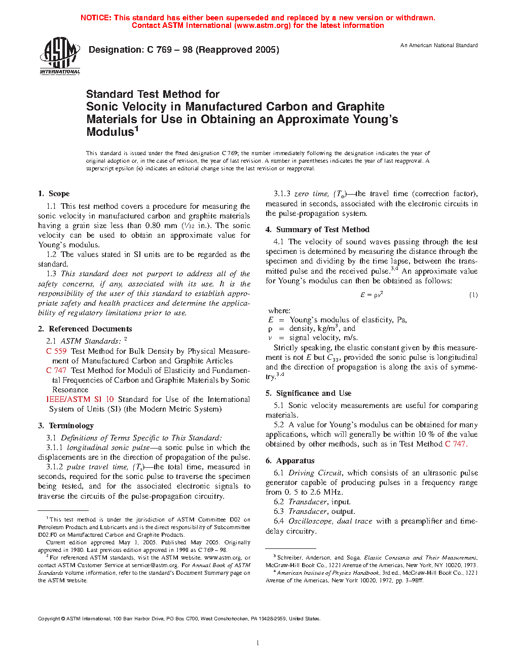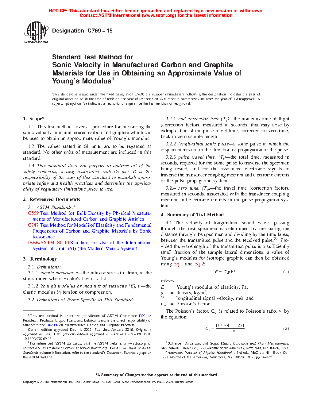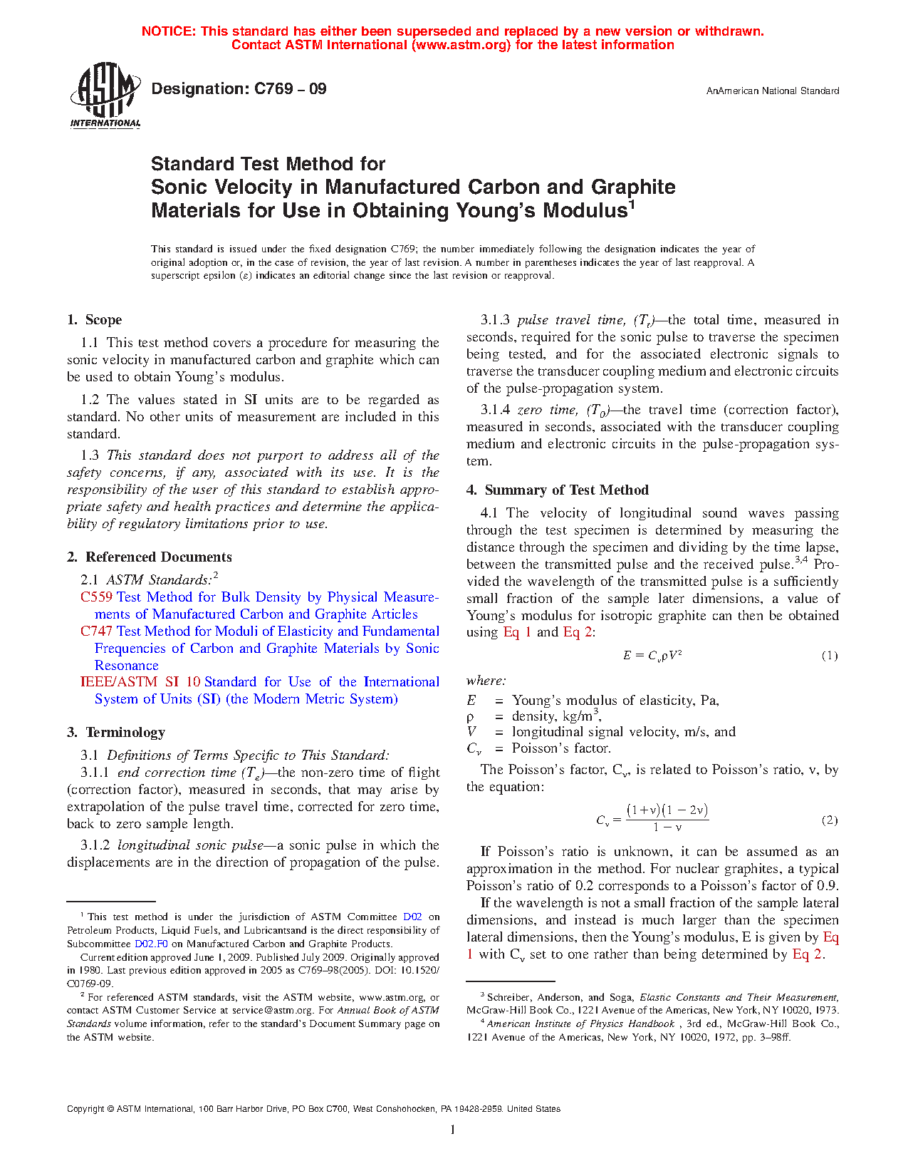 5.2 Eq 1 provides an accurate value of Young’s modulus only for isotropic, non-attenuative, and non-dispersive materials of infinite dimensions. For non-isotropic graphite, Eq 1 can be modified to take into account the Poisson’s ratios in all directions. As graphite is a strongly attenuative material, the value of Young’s modulus obtained with Eq 1 will be dependent on specimen length. If the specimen lateral dimensions are not large compared to the wavelength of the propagated pulse, then the value of Young’s modulus obtained with Eq 1 will be dependent on the specimen lateral dimensions. The accuracy of the Young's modulus calculated from Eq 1 will also depend upon the uncertainty in Poisson's ratio and its impact on the evaluation of the Poisson's factor in Eq 2. However, a value for Young's modulus can be obtained for many applications, which is often in good agreement with the value obtained by other more accurate methods, such as in Test Method C747. The technical issues and typical values of corresponding uncertainties are discussed in detail in STP 1578.5