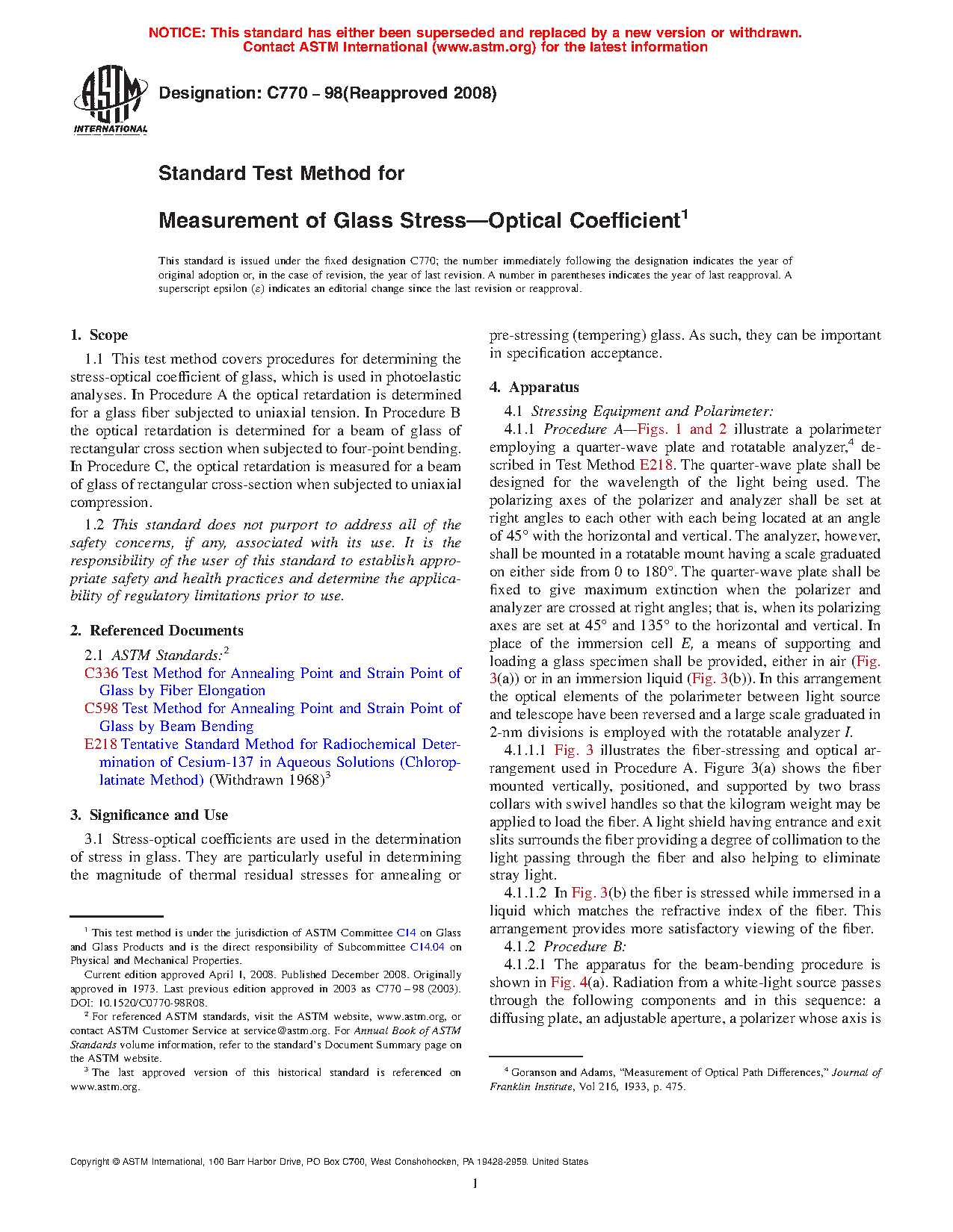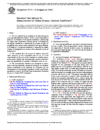 1.1 This test method covers procedures for determining the stress-optical coefficient of glass, which is used in photoelastic analyses. In Procedure A the optical retardation is determined for a glass fiber subjected to uniaxial tension. In Procedure B the optical retardation is determined for a beam of glass of rectangular cross section when subjected to four-point bending. In Procedure C, the optical retardation is measured for a beam of glass of rectangular cross-section when subjected to uniaxial compression.