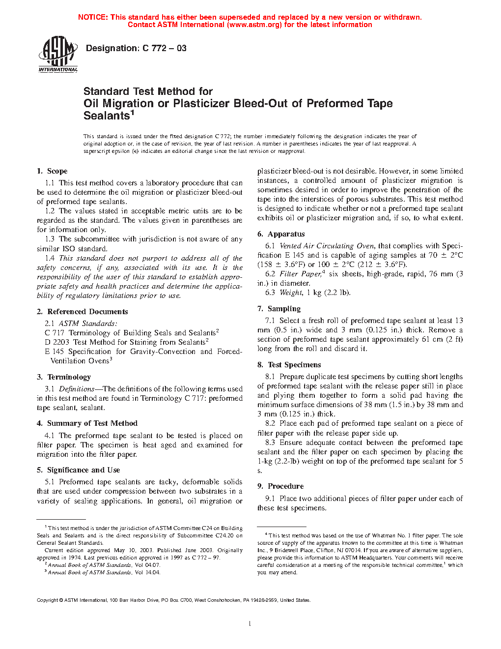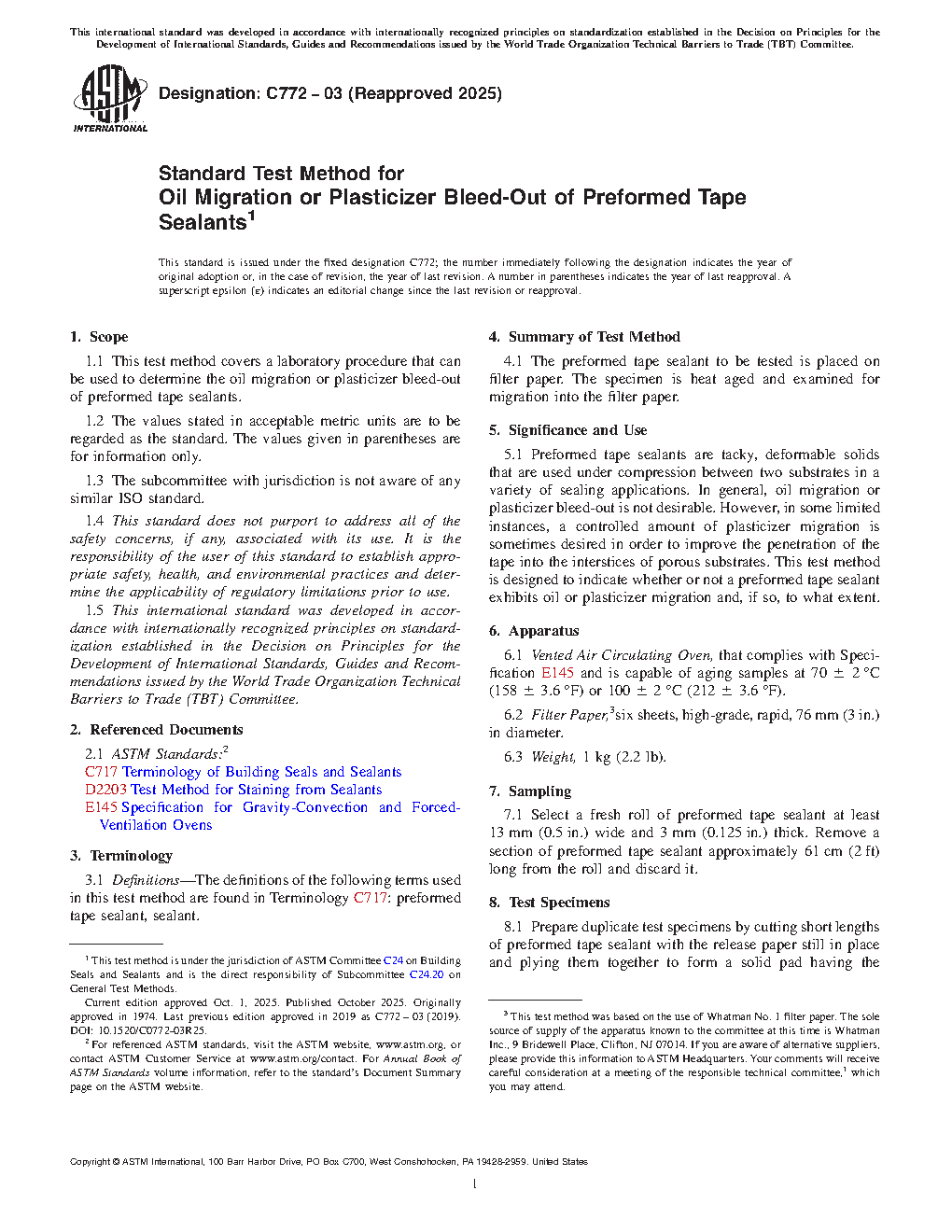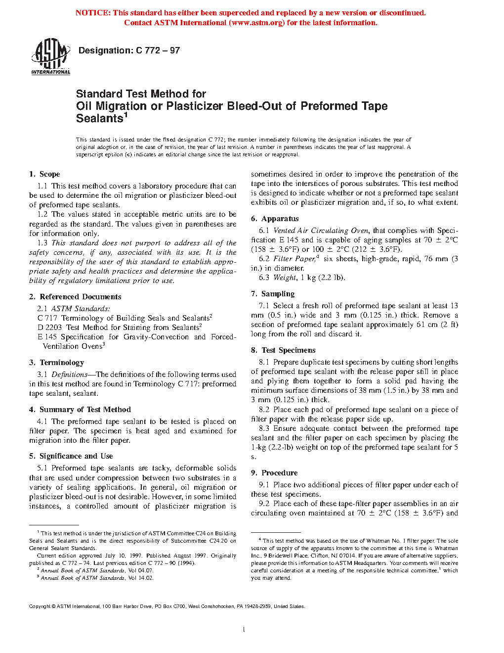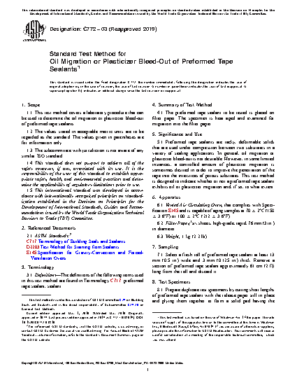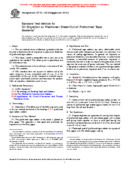 1.1 This test method covers a laboratory procedure that can be used to determine the oil migration or plasticizer bleed-out of preformed tape sealants.
