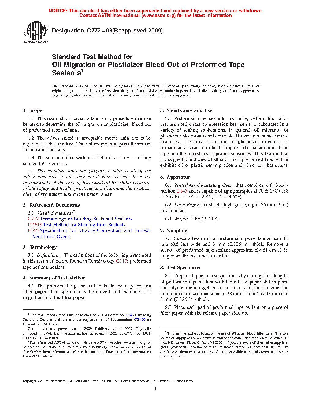 5.1 Preformed tape sealants are tacky, deformable solids that are used under compression between two substrates in a variety of sealing applications. In general, oil migration or plasticizer bleed-out is not desirable. However, in some limited instances, a controlled amount of plasticizer migration is sometimes desired in order to improve the penetration of the tape into the interstices of porous substrates. This test method is designed to indicate whether or not a preformed tape sealant exhibits oil or plasticizer migration and, if so, to what extent.