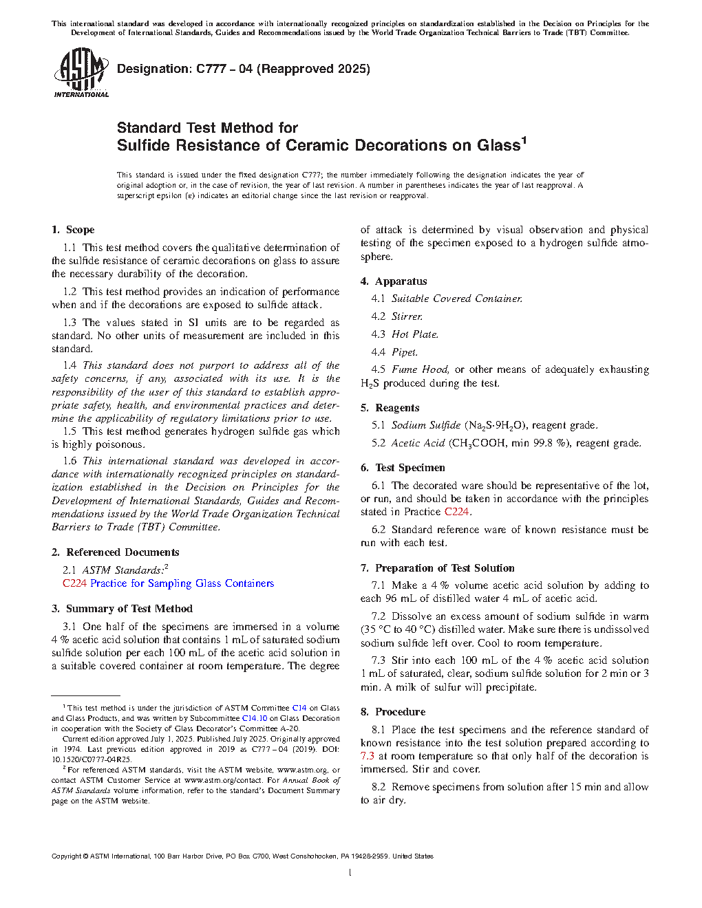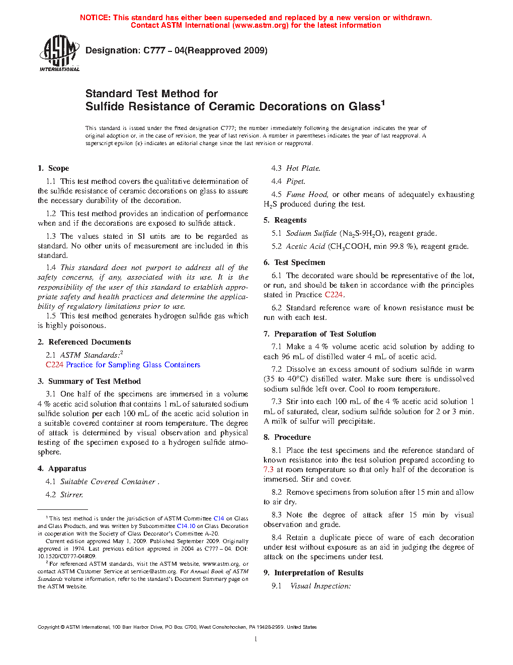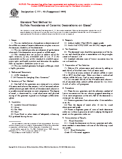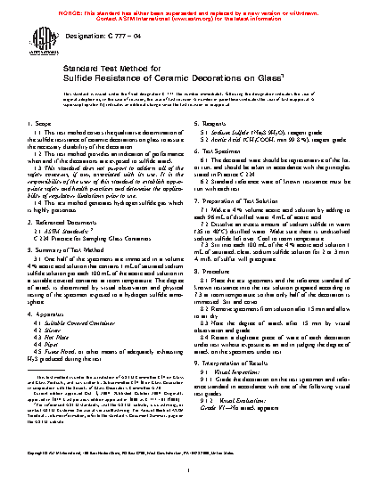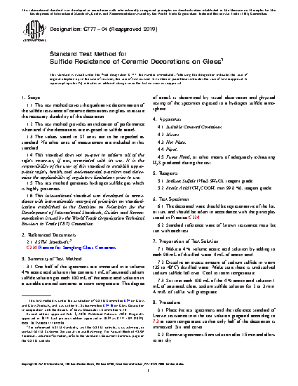1.1 This test method covers the qualitative determination of the sulfide resistance of ceramic decorations on glass to assure the necessary durability of the decoration.