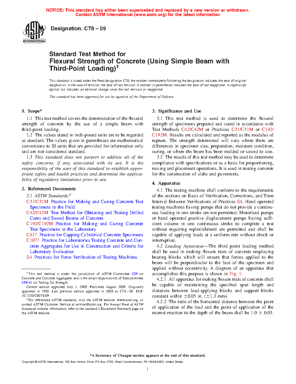 1.1 This test method covers the determination of the flexural strength of concrete by the use of a simple beam with third-point loading.