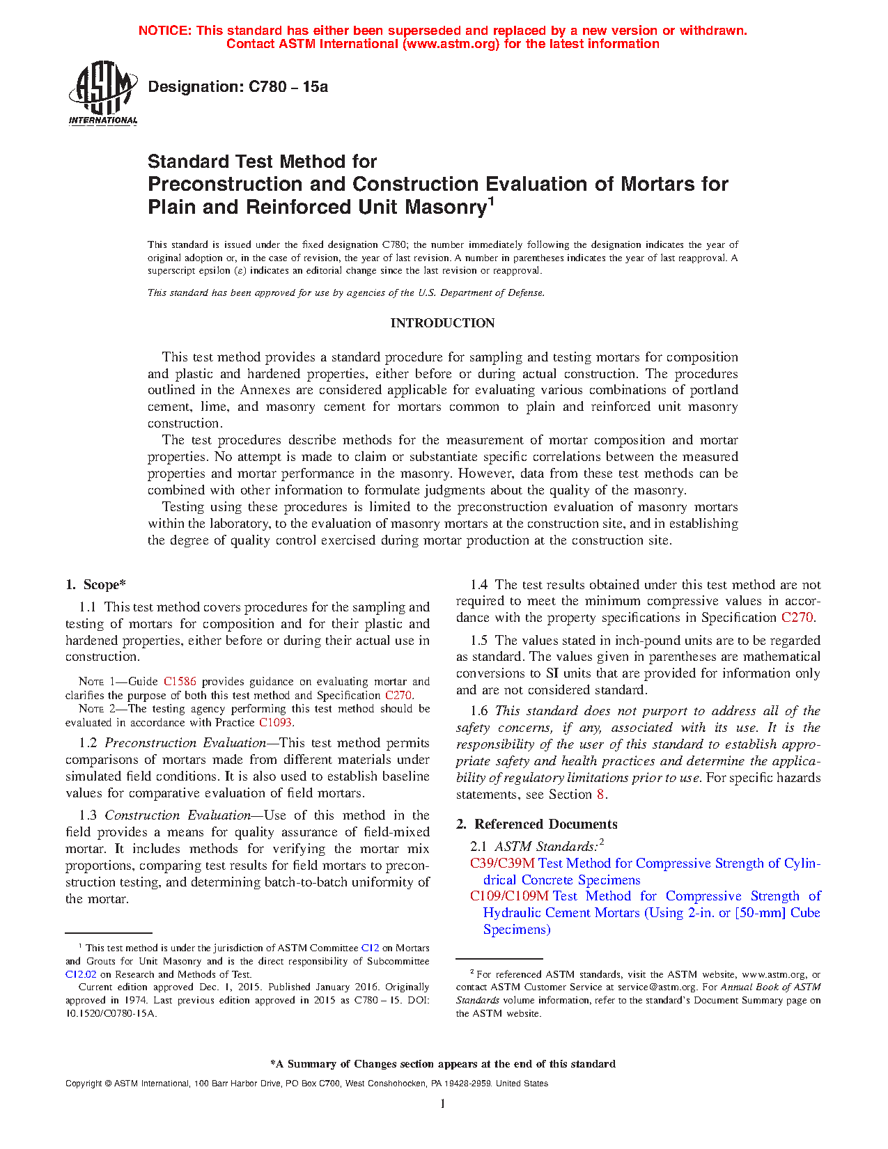1.2 Preconstruction Evaluation—This test method permits comparisons of mortars made from different materials under simulated field conditions. It is also used to establish baseline values for comparative evaluation of field mortars.