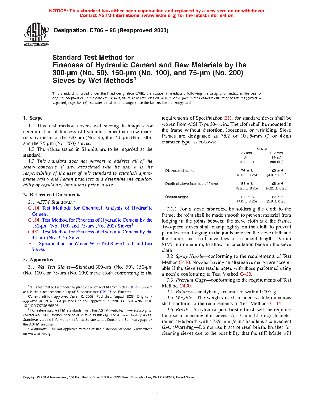 1.1 This test method covers wet sieving techniques for determination of fineness of hydraulic cement and raw materials by means of the 300-μm (No. 50), the 150-μm (No. 100), and the 75-μm (No. 200) sieves.