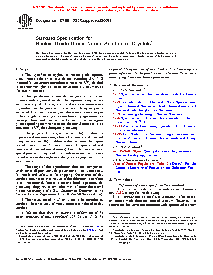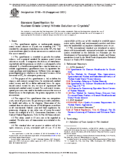 1.2 This specification is intended to provide the nuclear industry with a general standard for aqueous uranyl nitrate solution or crystals. It recognizes the diversity of manufacturing methods and the processes to which it is subsequently to be subjected. It is therefore anticipated that it may be necessary to include supplementary specification limits by agreement between purchaser and manufacturer. Different limits are appropriate depending on whether or not the uranyl nitrate is to be converted to UF6 for subsequent processing.