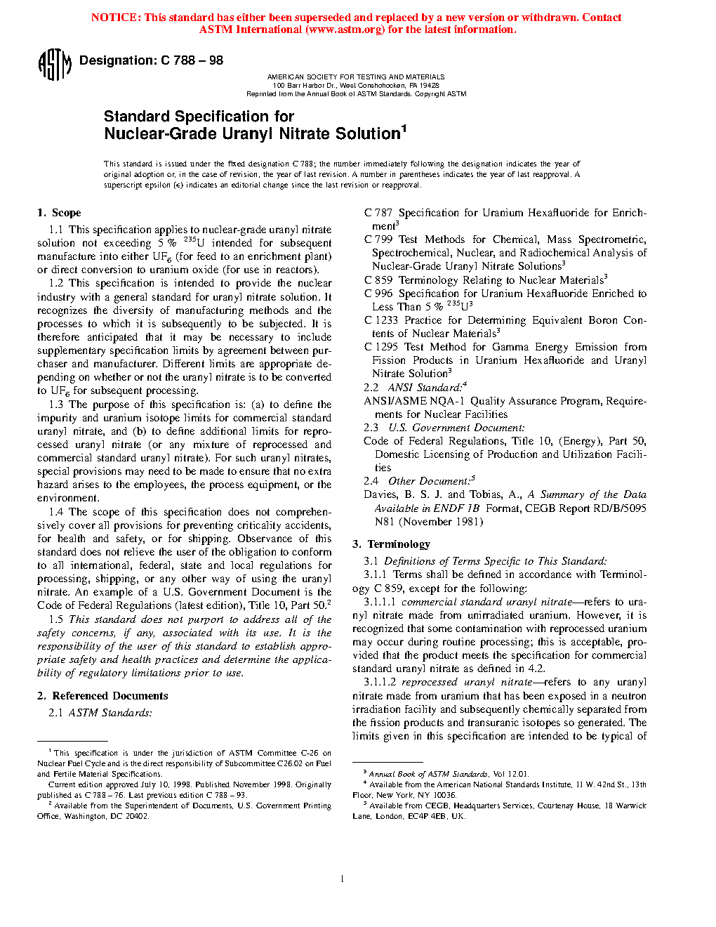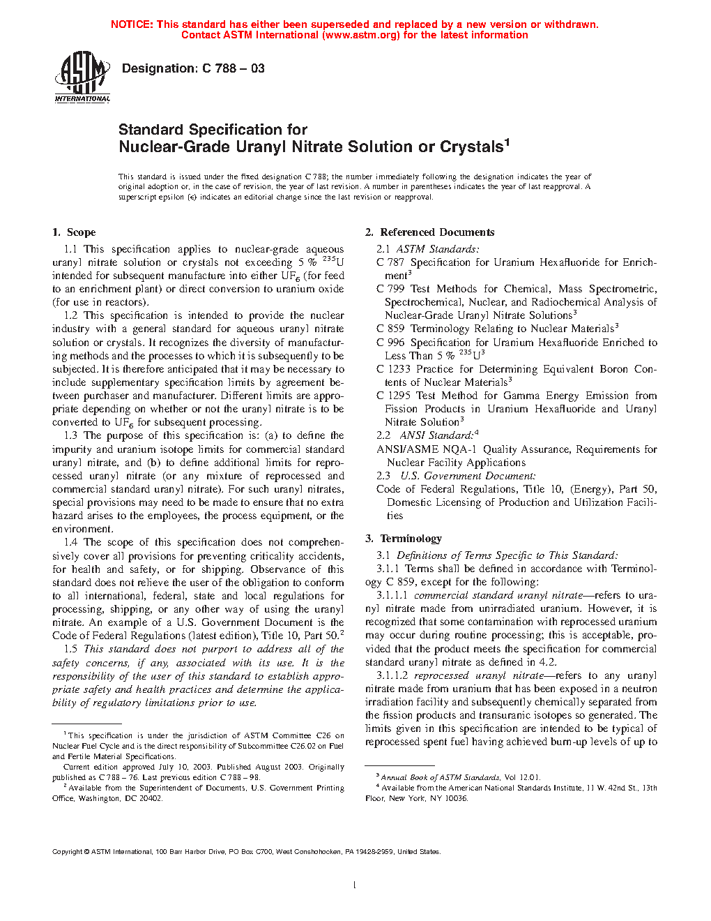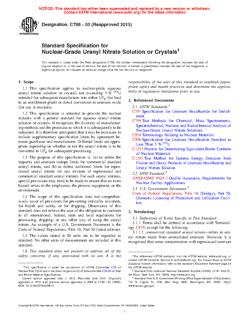 1.4 The scope of this specification does not comprehensively cover all provisions for preventing criticality accidents, for health and safety, or for shipping. Observance of this standard does not relieve the user of the obligation to conform to all international, federal, state and local regulations for processing, shipping, or any other way of using the uranyl nitrate. An example of a U.S. Government Document is the Code of Federal Regulations, Title 10, Part 50 (latest edition).
