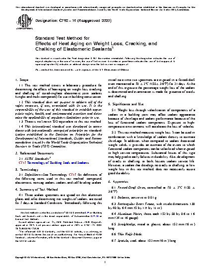 1.1 This test method covers a laboratory procedure for determining the effects of heat aging on weight loss, cracking, and chalking of cured-in-place elastomeric joint sealants (single- and multi-component) for use in building construction.