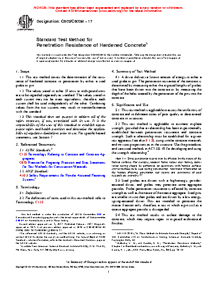 1.1 This test method covers the determination of the resistance of hardened concrete to penetration by either a steel probe or pin.