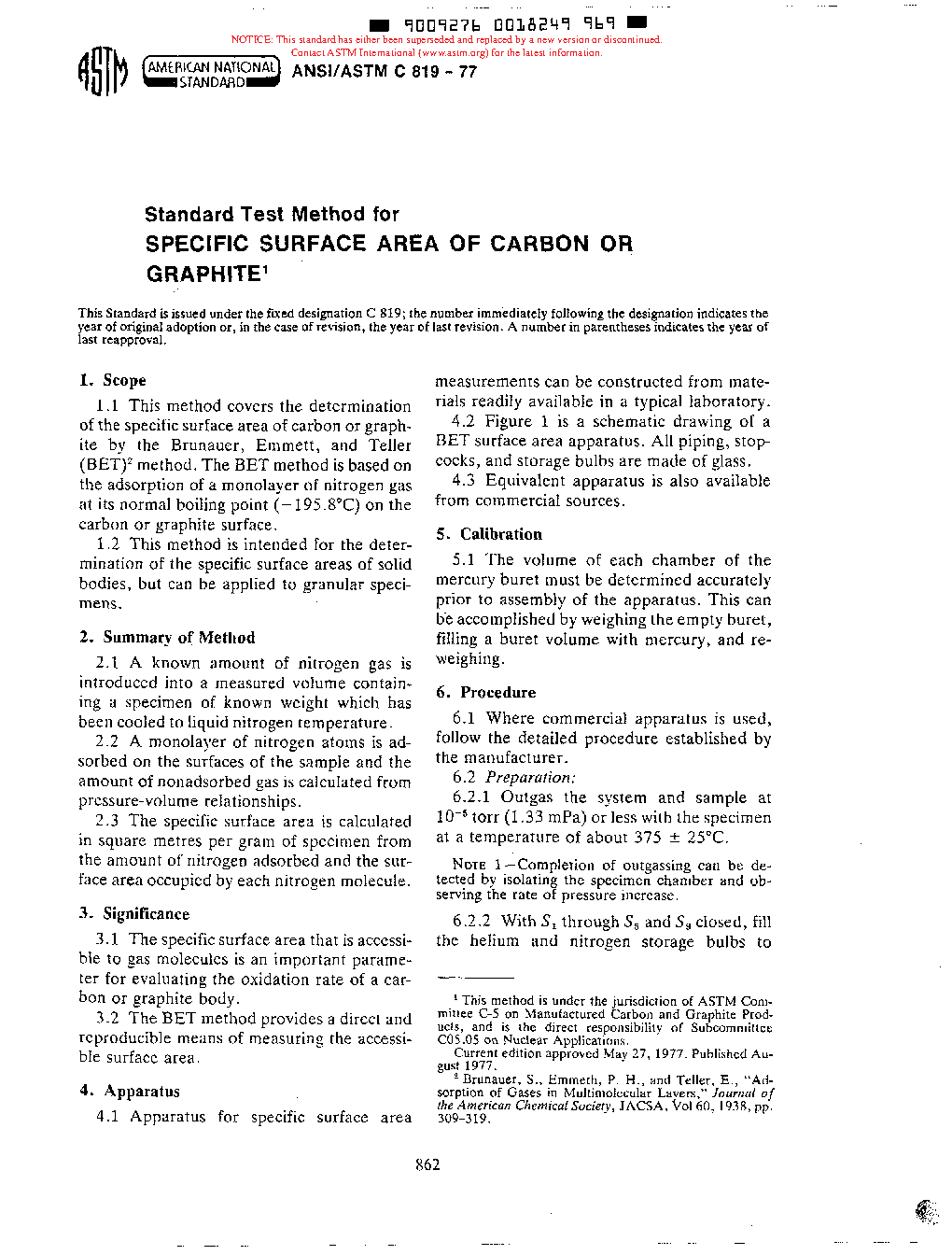 Test Method for Specific Surface Area of Carbon or Graphite (Withdrawn 1987)