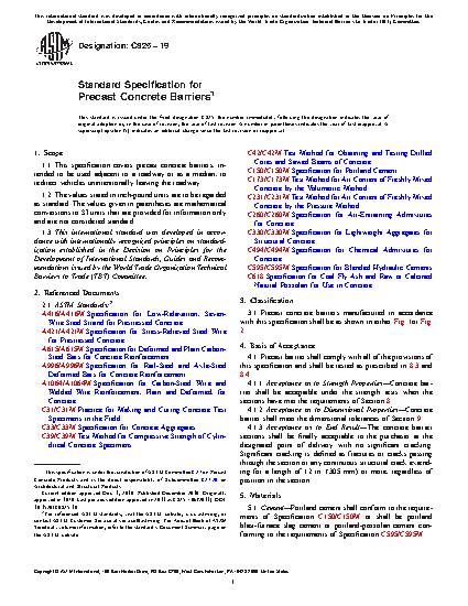 1.1 This specification covers precast concrete barriers, intended to be used adjacent to a roadway or as a median, to redirect vehicles unintentionally leaving the roadway.