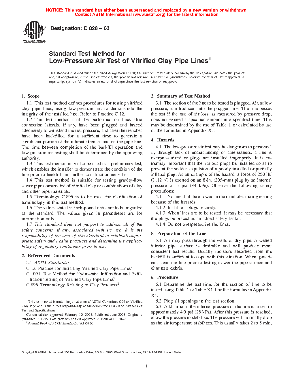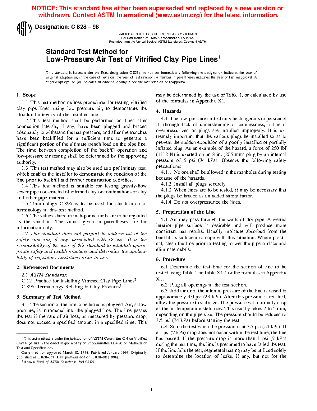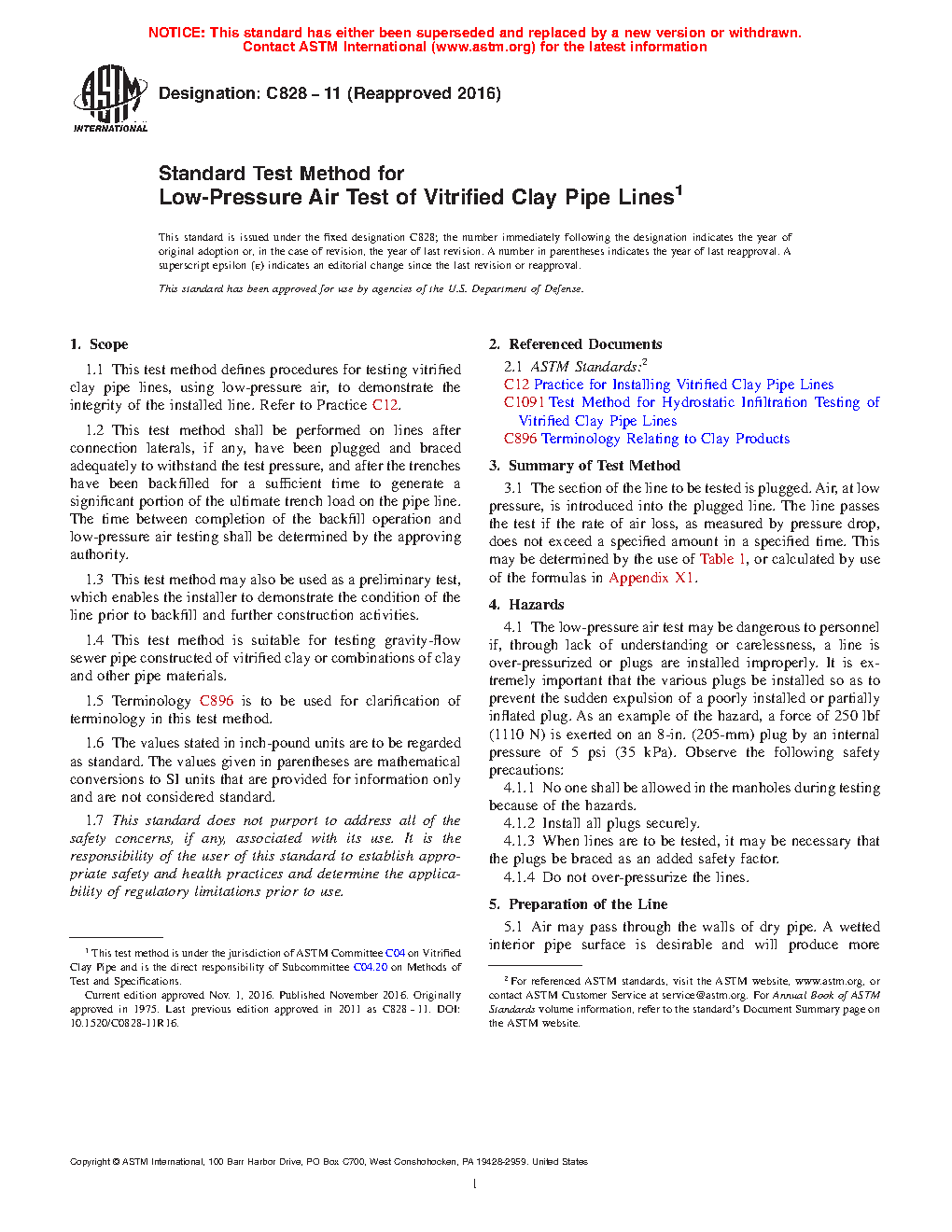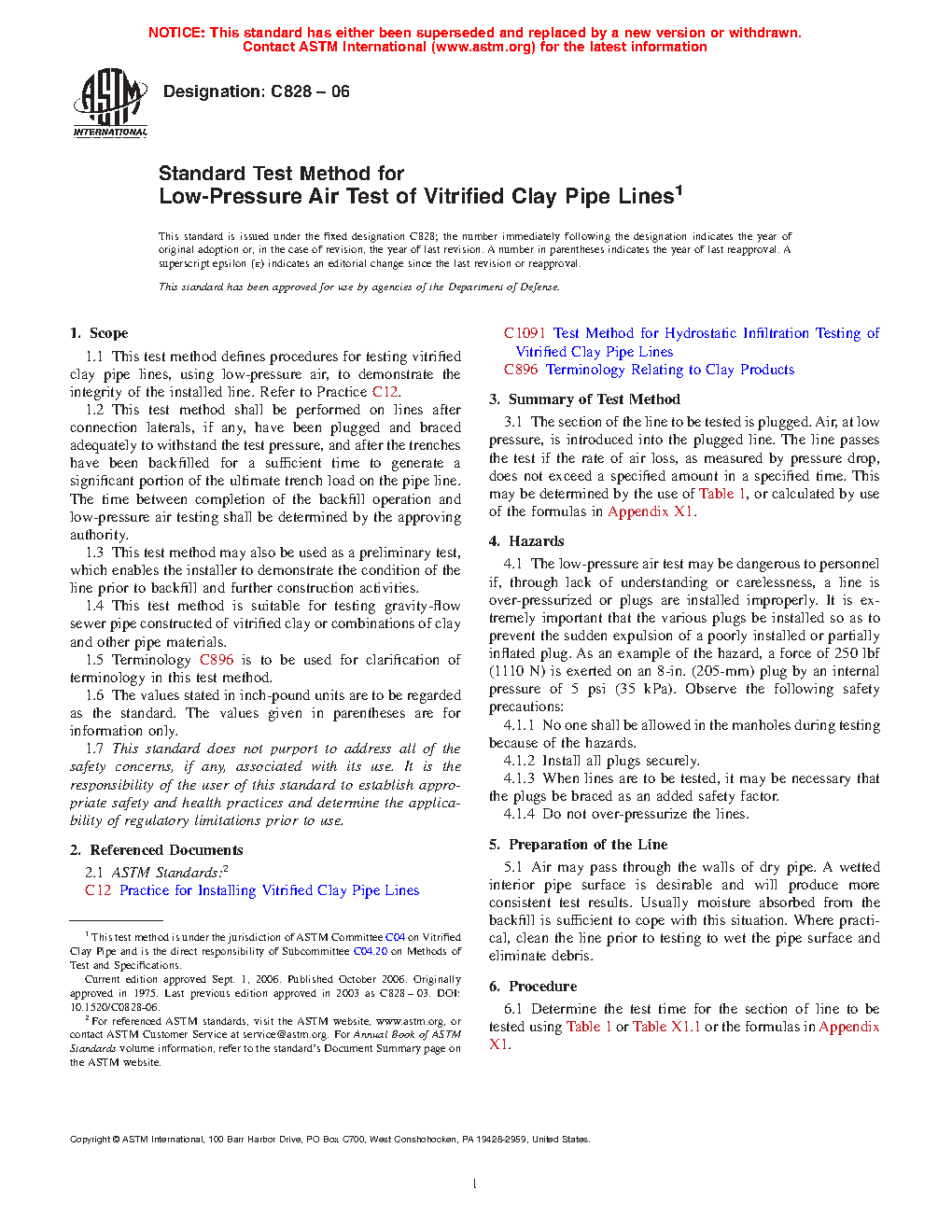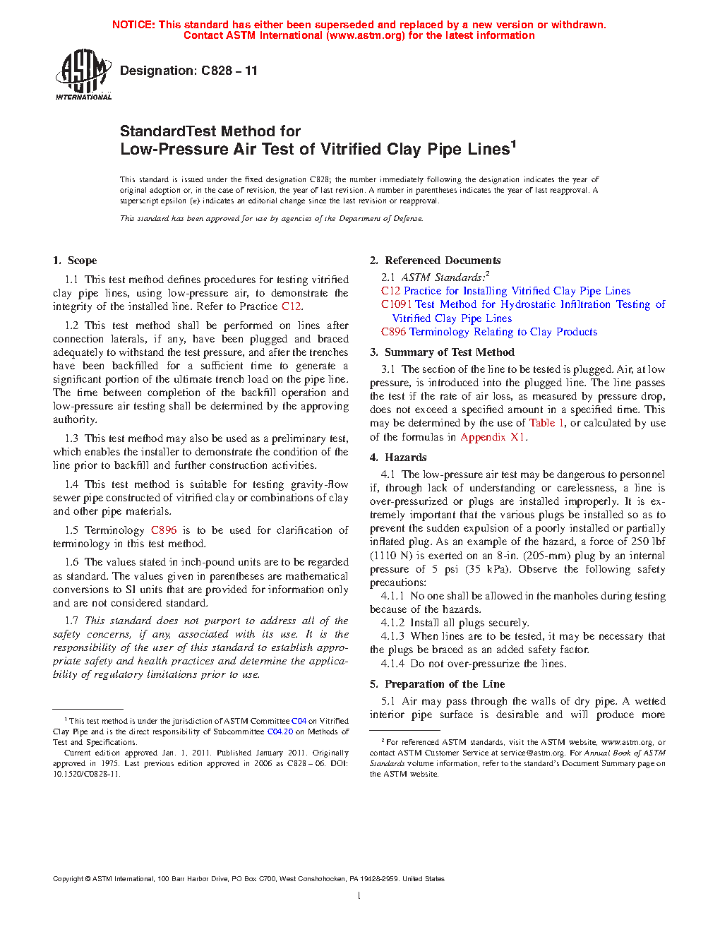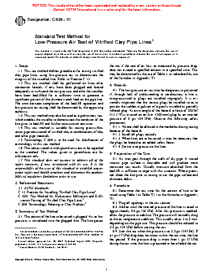 1.1 This test method defines procedures for testing vitrified clay pipe lines, using low-pressure air, to demonstrate the integrity of the installed line. Refer to Practice C12.