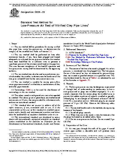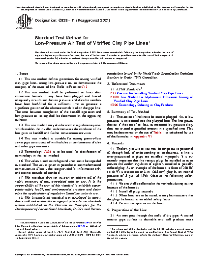 This test method contains procedures using low-pressure air for testing the integrity of installed vitrified clay pipe lines such as gravity-flow sewer pipes. The procedures detailed here should be performed on lines after adequately and properly plugging and bracing connection laterals, if any, and after the trenches are backfilled for a sufficient time. This test method can also be used as a preliminary test to demonstrate the condition of the line prior to backfill and further construction activities.