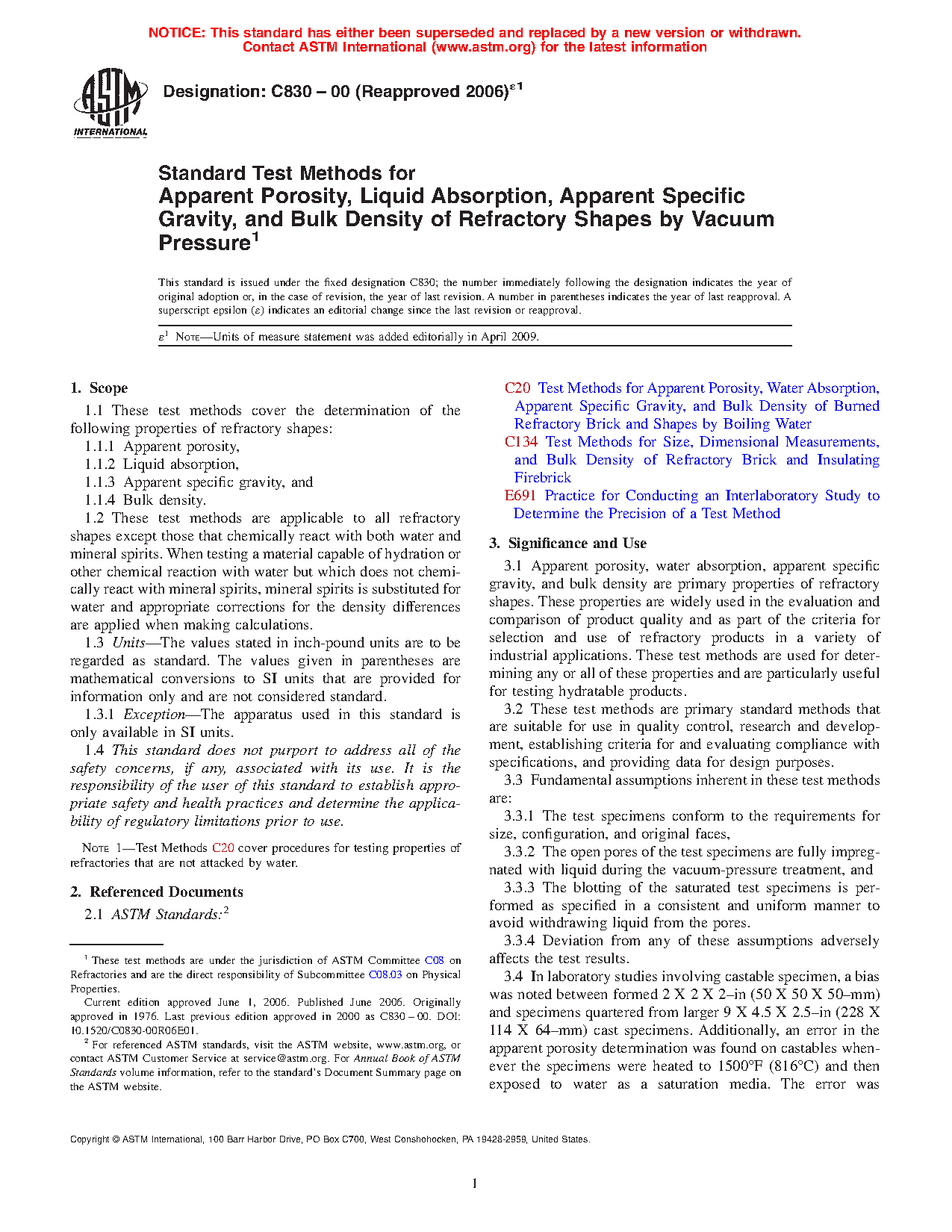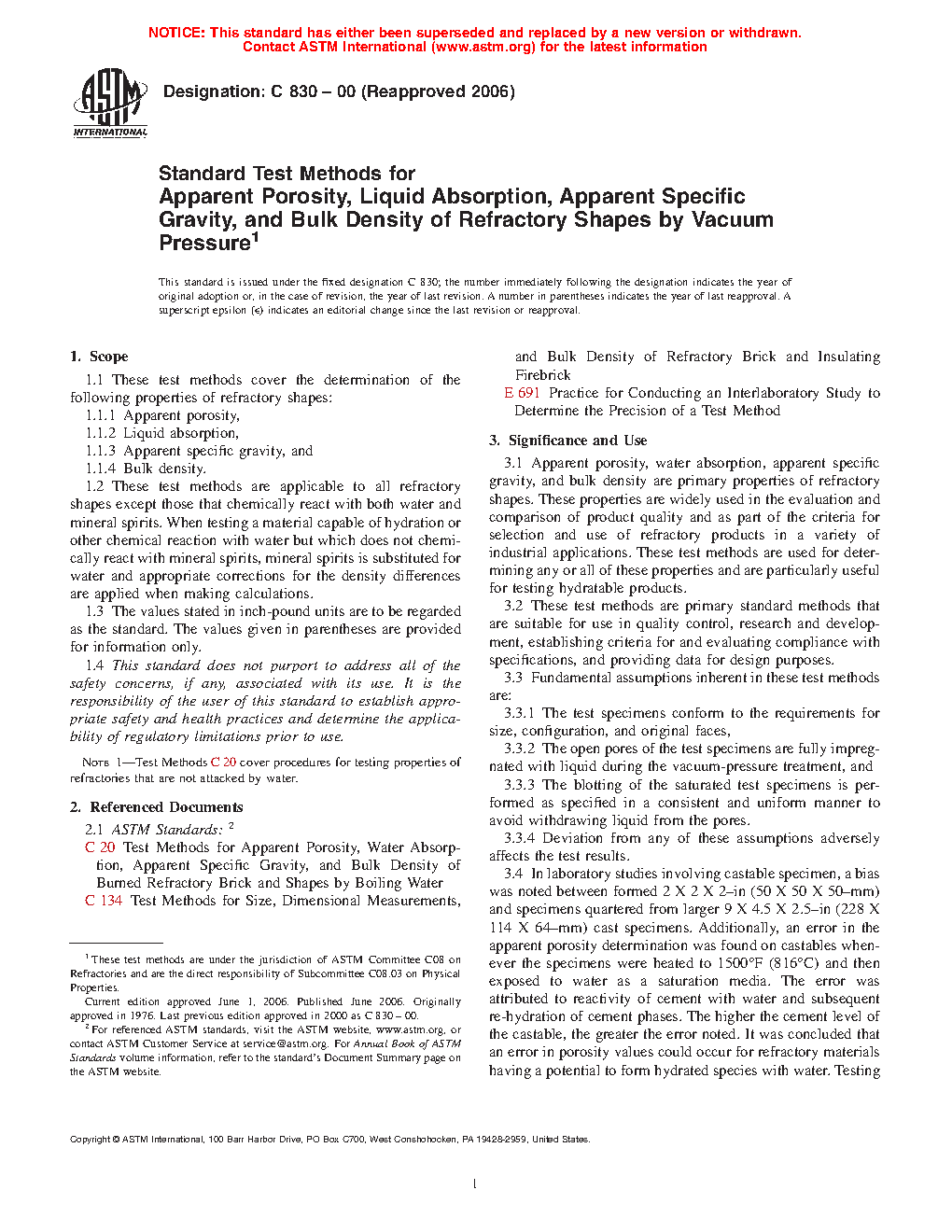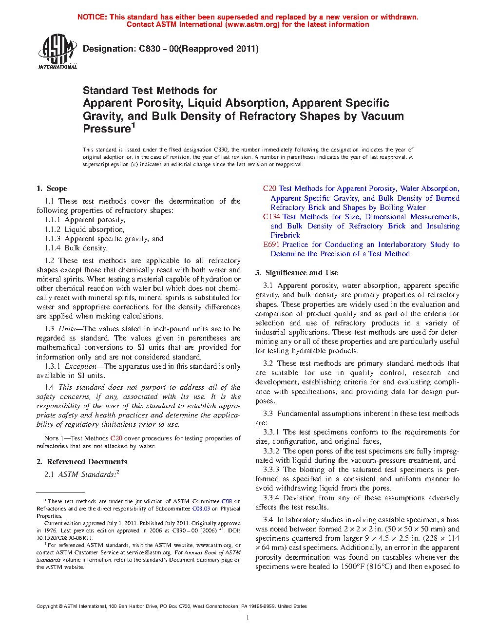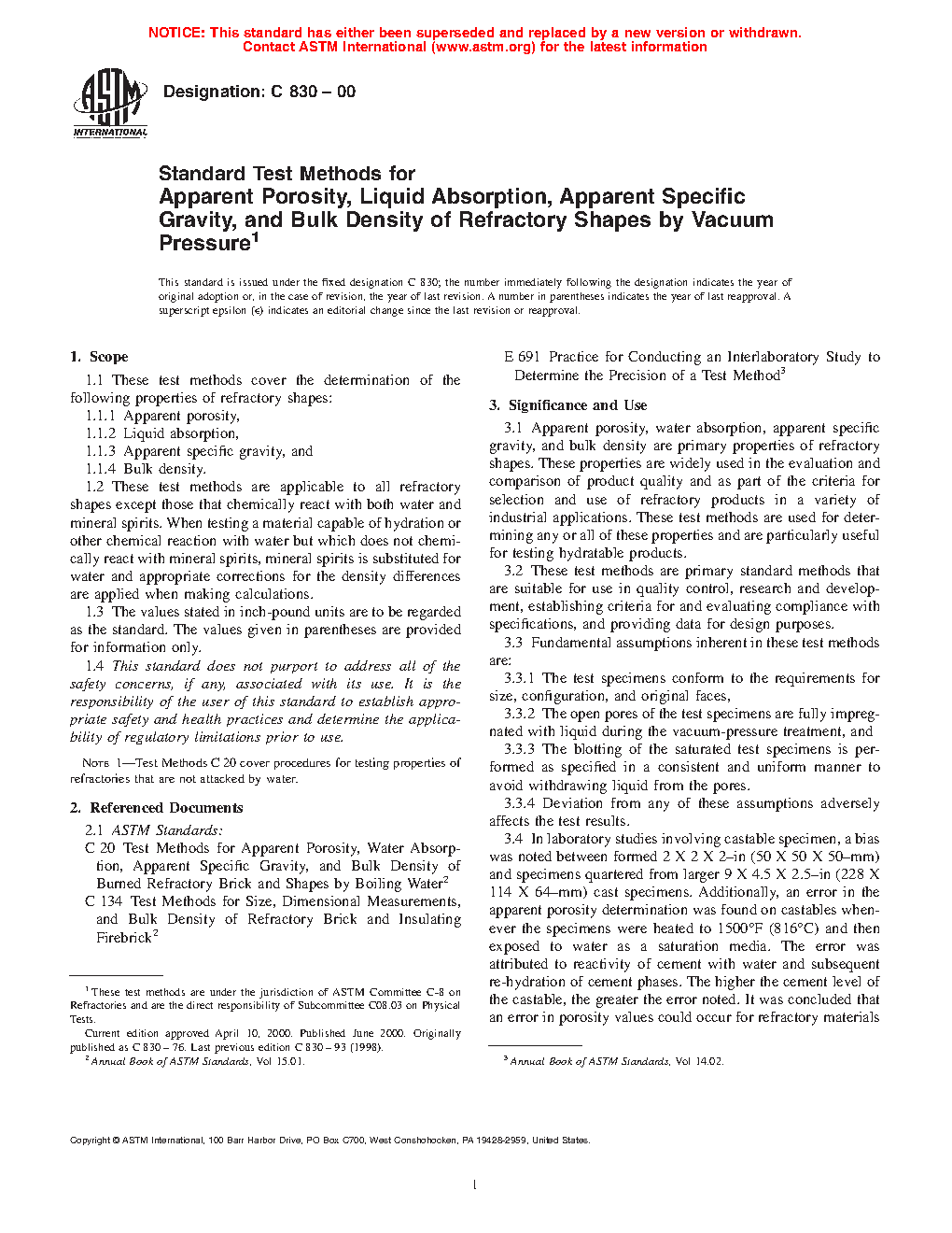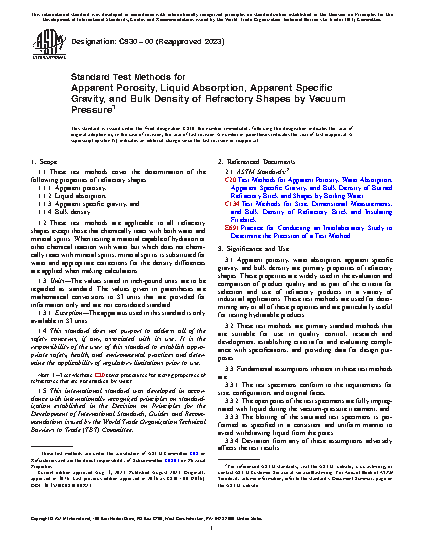 3.1 Apparent porosity, water absorption, apparent specific gravity, and bulk density are primary properties of refractory shapes. These properties are widely used in the evaluation and comparison of product quality and as part of the criteria for selection and use of refractory products in a variety of industrial applications. These test methods are used for determining any or all of these properties and are particularly useful for testing hydratable products.