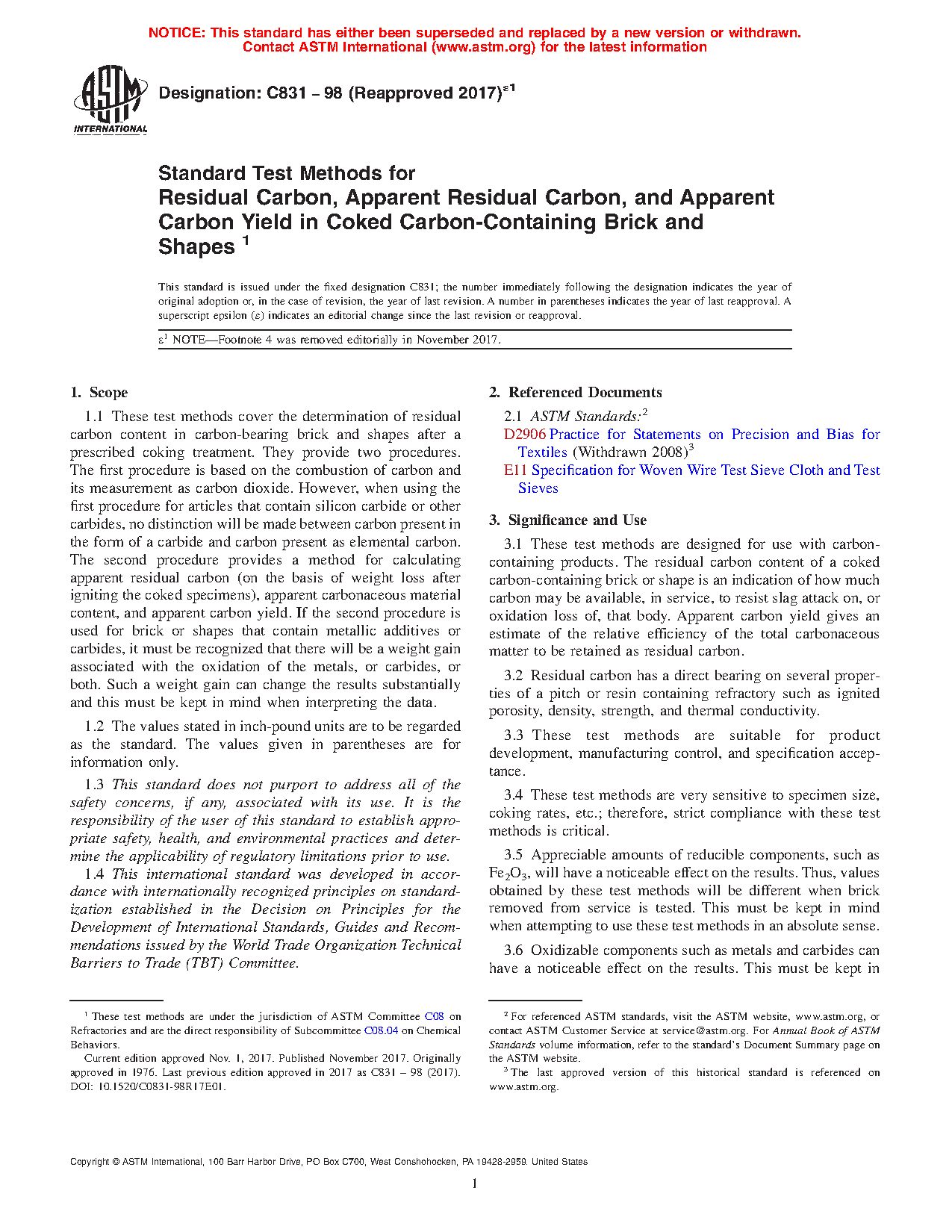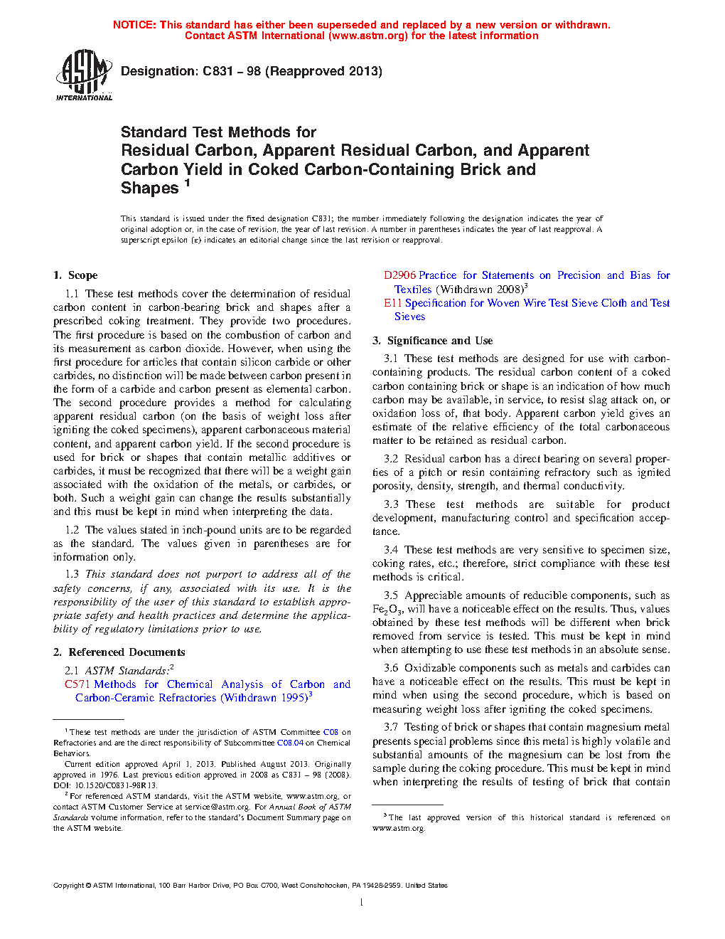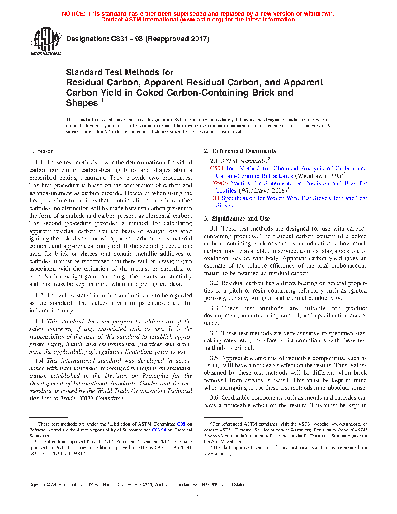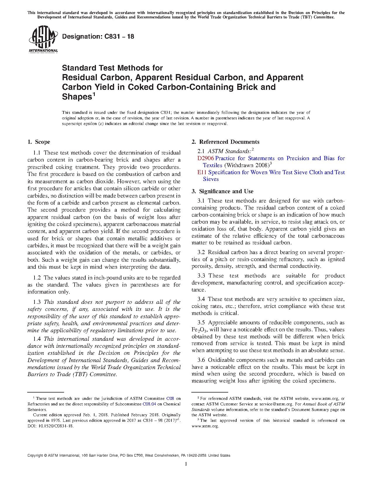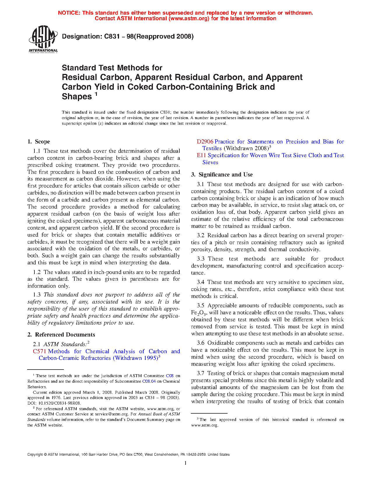 These test methods are designed for use with carbon-containing products. The residual carbon content of a coked carbon containing brick or shape is an indication of how much carbon may be available, in service, to resist slag attack on, or oxidation loss of, that body. Apparent carbon yield gives an estimate of the relative efficiency of the total carbonaceous matter to be retained as residual carbon.