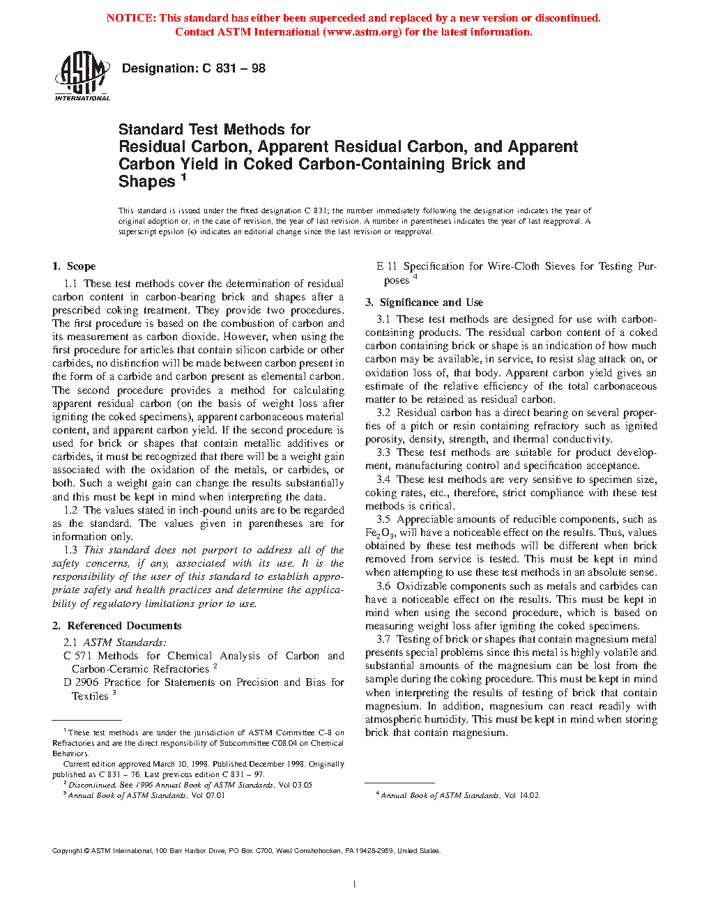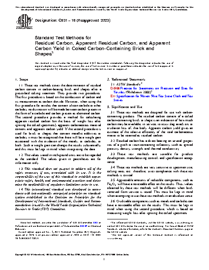 1.1 These test methods cover the determination of residual carbon content in carbon-bearing brick and shapes after a prescribed coking treatment. They provide two procedures. The first procedure is based on the combustion of carbon and its measurement as carbon dioxide. However, when using the first procedure for articles that contain silicon carbide or other carbides, no distinction will be made between carbon present in the form of a carbide and carbon present as elemental carbon. The second procedure provides a method for calculating apparent residual carbon (on the basis of weight loss after igniting the coked specimens), apparent carbonaceous material content, and apparent carbon yield. If the second procedure is used for brick or shapes that contain metallic additives or carbides, it must be recognized that there will be a weight gain associated with the oxidation of the metals, or carbides, or both. Such a weight gain can change the results substantially and this must be kept in mind when interpreting the data.