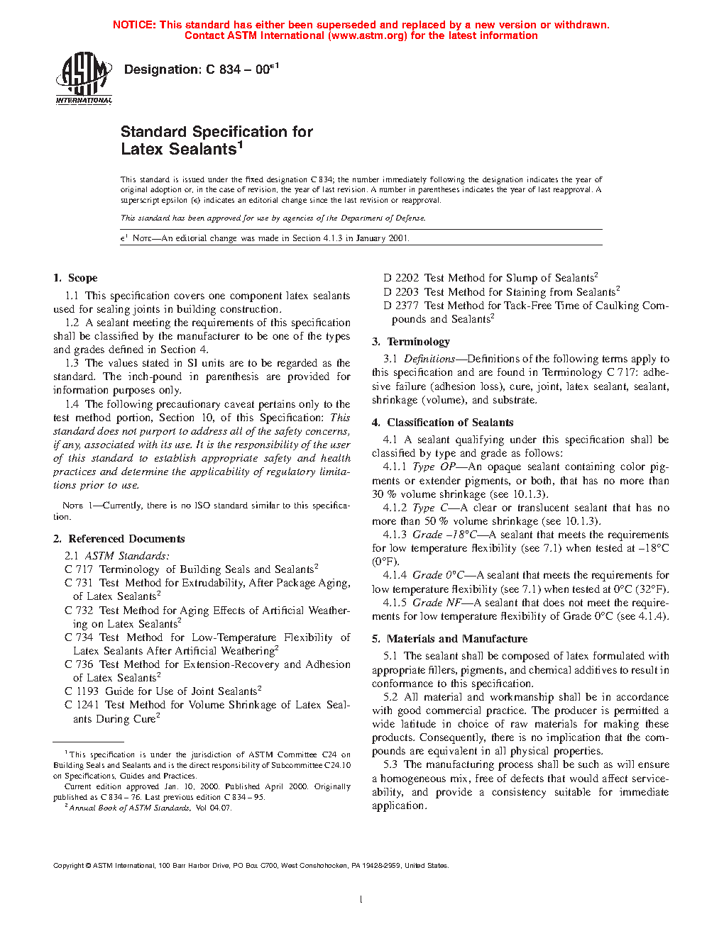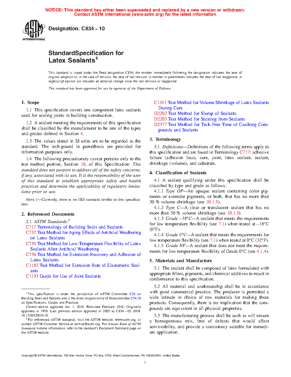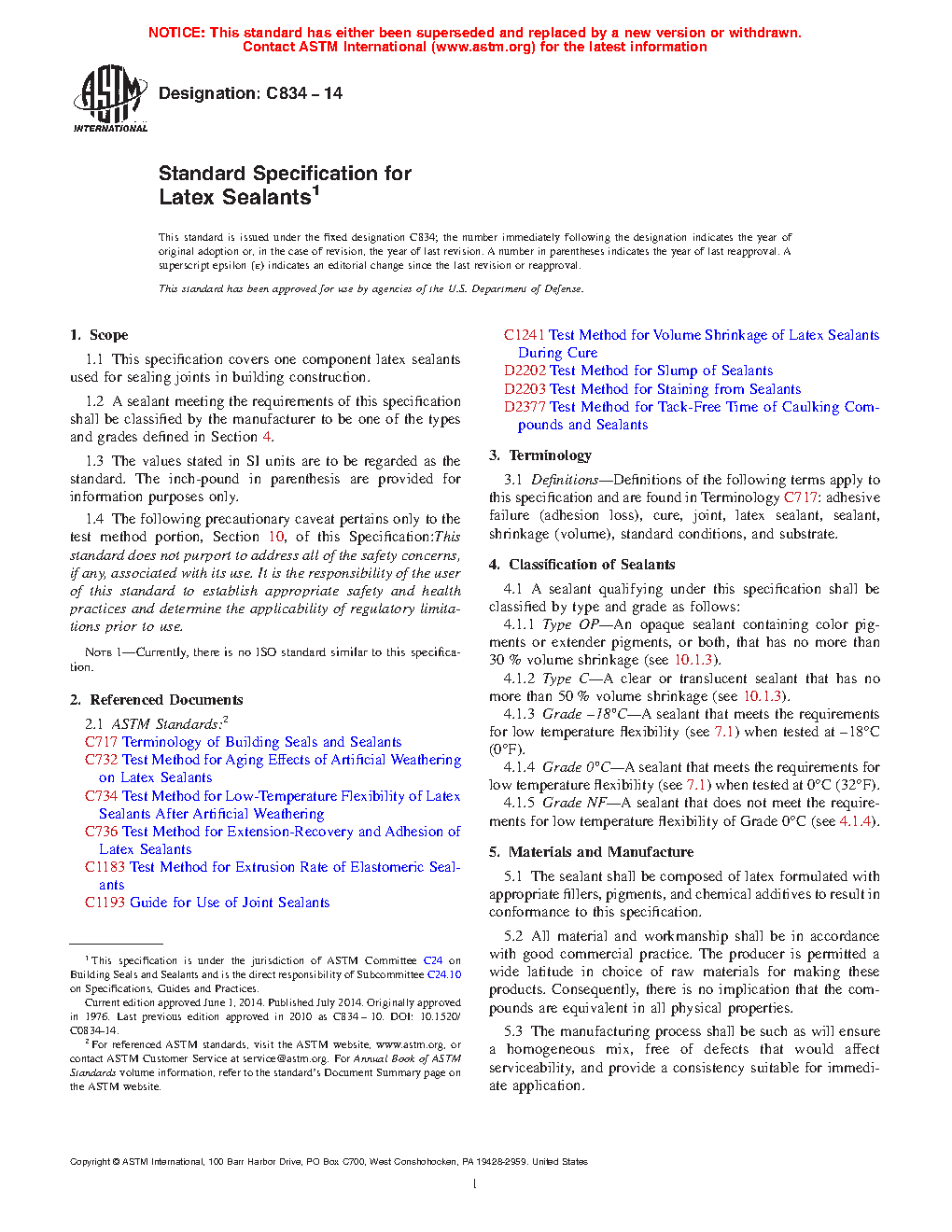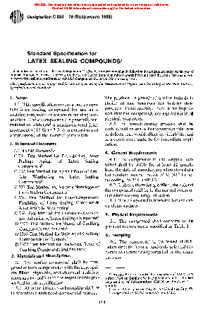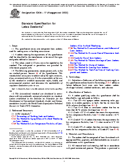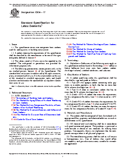 8.1 This specification covers two types and three grades of latex sealants as described in Section 4 that are formulated for general caulking and sealing operations in building construction. It should be recognized by the user that not all sealants meeting this specification are suitable for all applications and all substrates. It is essential, therefore, that the type and grade be specified for proper description of a sealant. Test methods relate to special standard substrates of glass, wood and aluminum. If tests are required using substrates in addition to or other than standard, they should be so specified for testing.