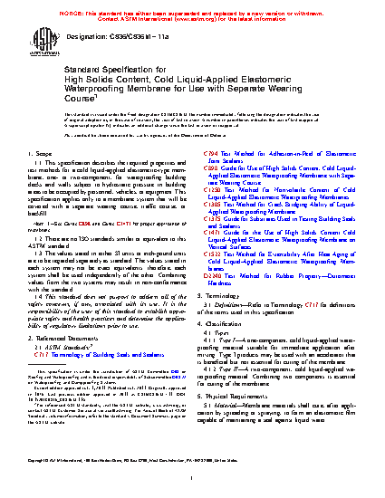 1.1 This specification describes the required properties and test methods for a cold liquid-applied elastomeric-type membrane, one- or two-component, for waterproofing building decks and walls subject to hydrostatic pressure in building areas to be occupied by personnel, vehicles, or equipment. This specification applies only to a membrane system that will be covered with a separate wearing course, traffic course, or backfill.