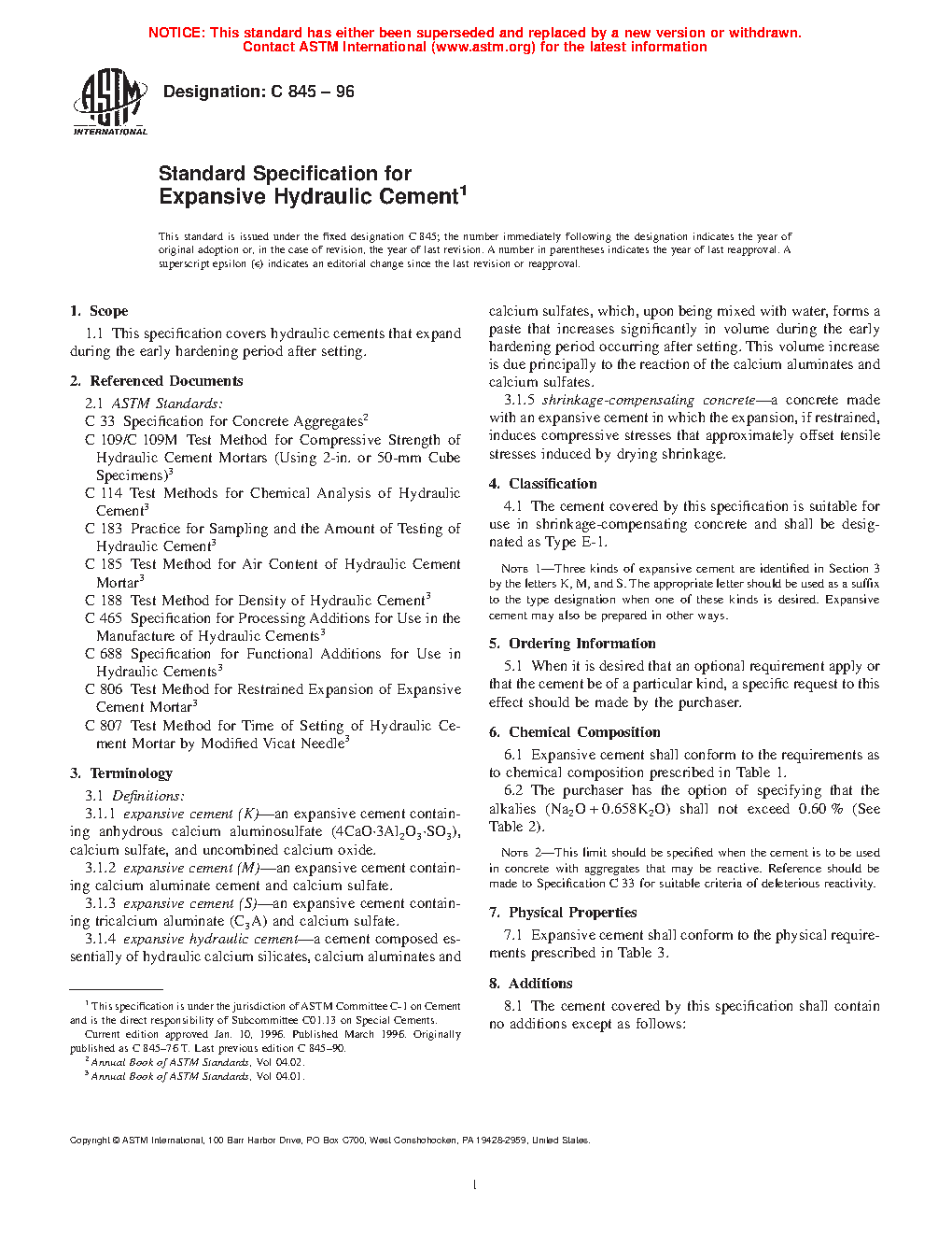 This specification covers hydraulic cements that expand during the early hardening period after setting. The cement covered by this specification is suitable for use in shrinkage-compensating concrete and shall be designated as Type E-1. Expansive cement shall conform to the requirements as to chemical composition prescribed. Expansive cement shall conform to the physical requirements prescribed. The cement shall be sampled and the properties shall be determined with the following test methods: sampling, chemical analysis, time of setting, air content, restrained expansion of mortar, compressive strength, and density.
