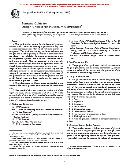 1.1 This guide defines criteria for the design of glovebox systems to be used for the handling of plutonium in any chemical or physical form or isotopic composition or when mixed with other elements or compounds. Not included in the criteria are systems auxiliary to the glovebox systems such as utilities, ventilation, alarm, and waste disposal. Also not addressed are hot cells or open-face hoods. The scope of this guide excludes specific license requirements relating to provisions for criticality prevention, hazards control, safeguards, packaging, and material handling. Observance of this guide does not relieve the user of the obligation to conform to all federal, state, and local regulations for design and construction of glovebox systems.