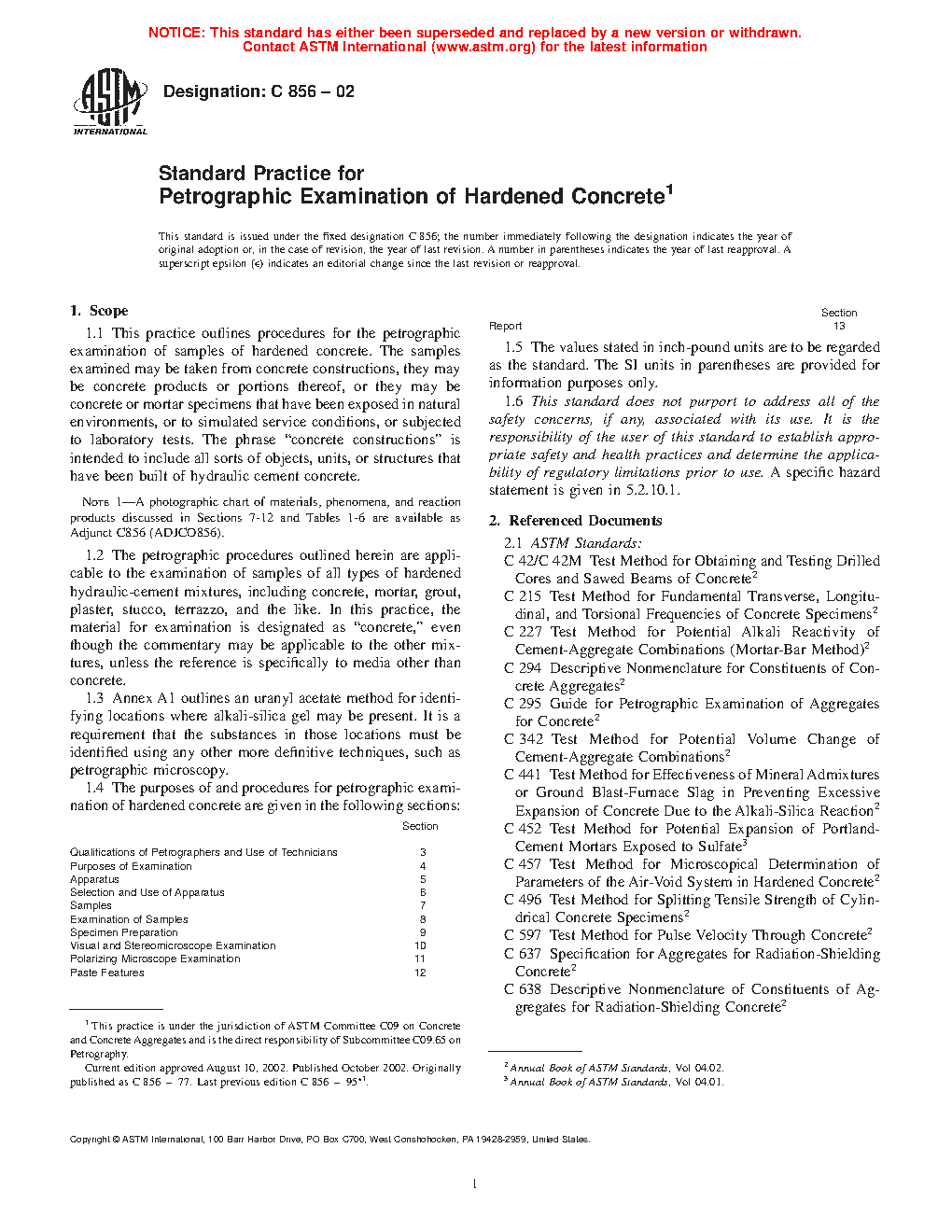 1.3 The purposes of and procedures for petrographic examination of hardened concrete are given in the following sections: