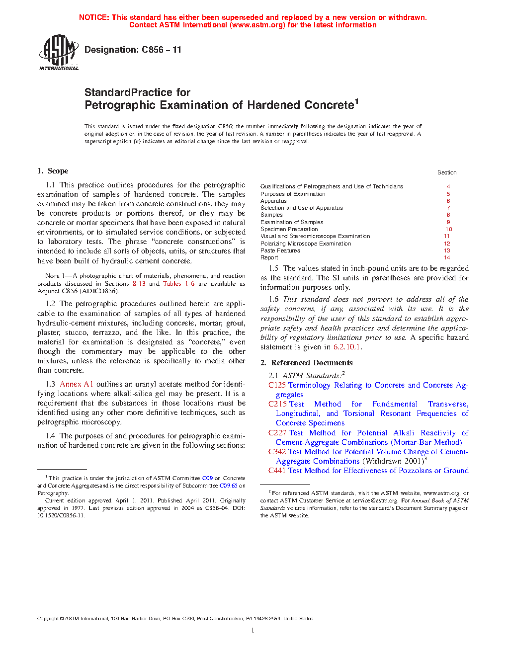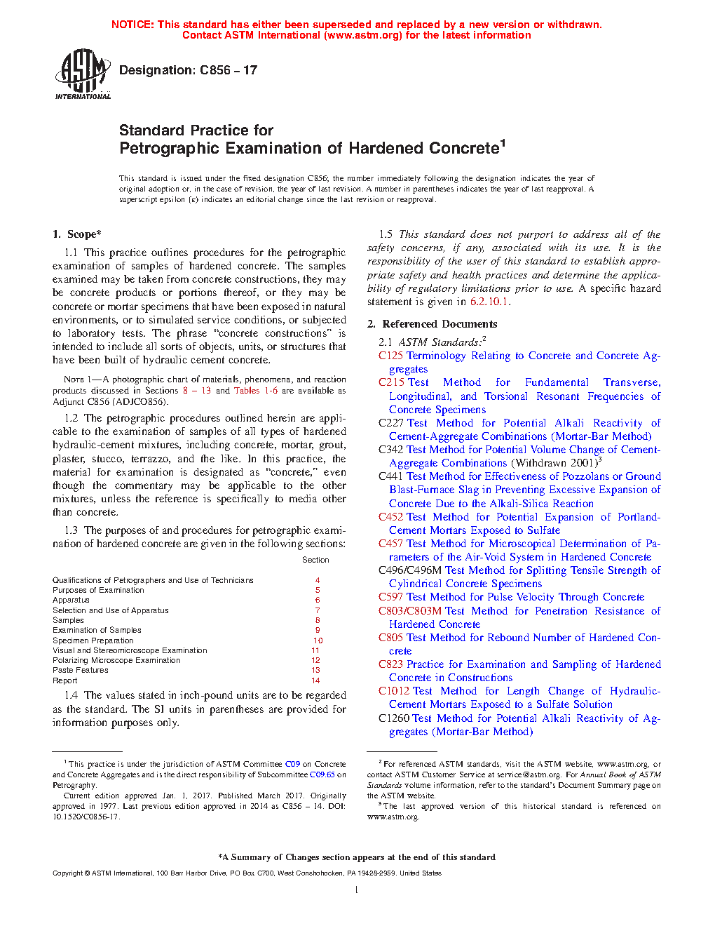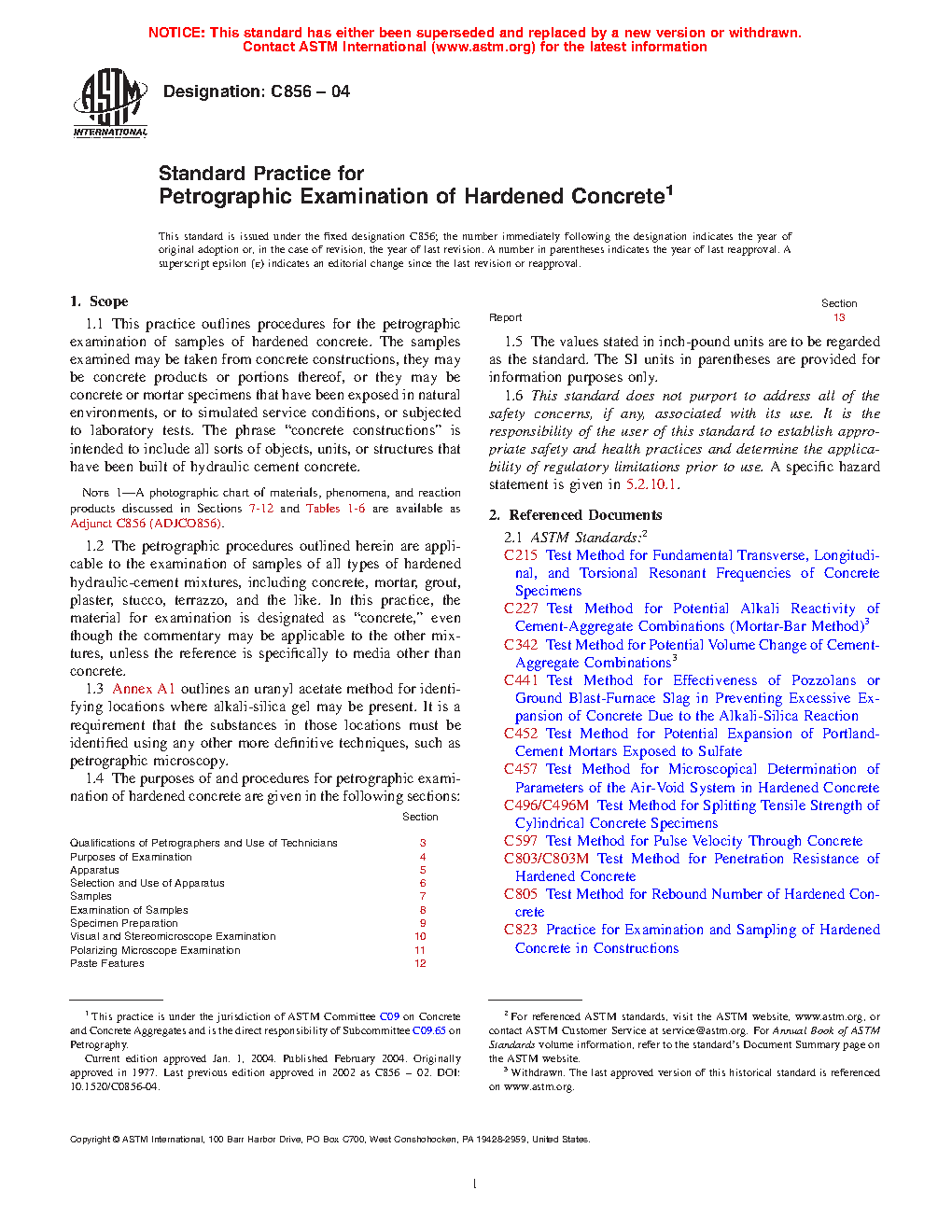 1.3 The purposes of and procedures for petrographic examination of hardened concrete are given in the following sections: