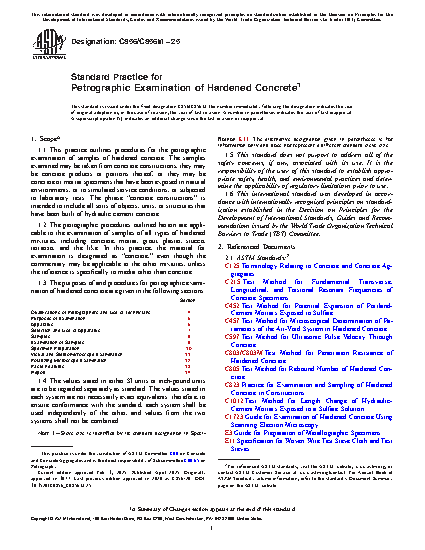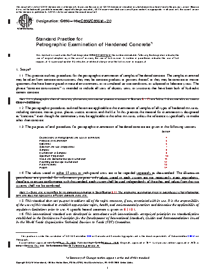 1.1 This practice outlines procedures for the petrographic examination of samples of hardened concrete. The samples examined may be taken from concrete constructions, they may be concrete products or portions thereof, or they may be concrete or mortar specimens that have been exposed in natural environments, or to simulated service conditions, or subjected to laboratory tests. The phrase “concrete constructions” is intended to include all sorts of objects, units, or structures that have been built of hydraulic cement concrete.