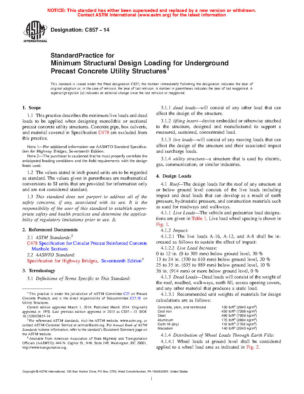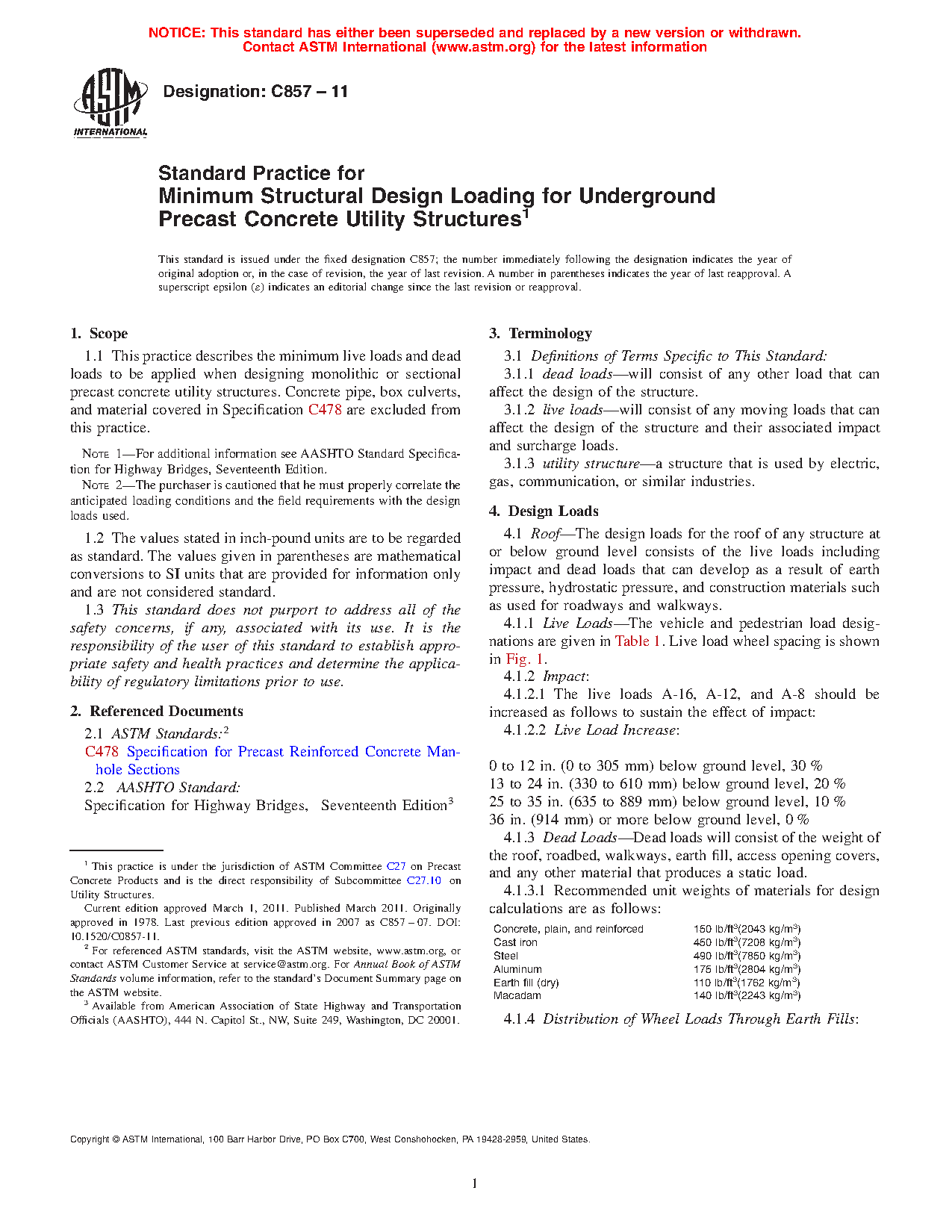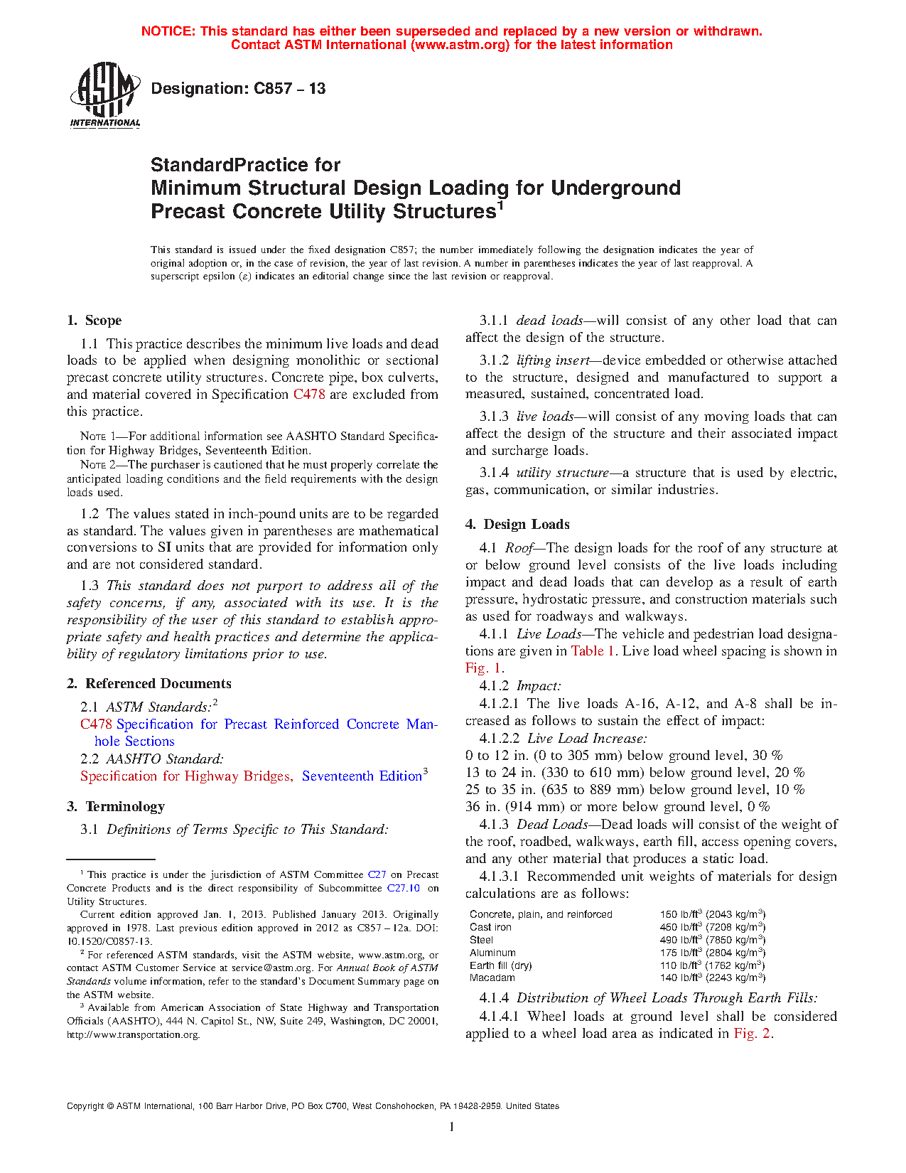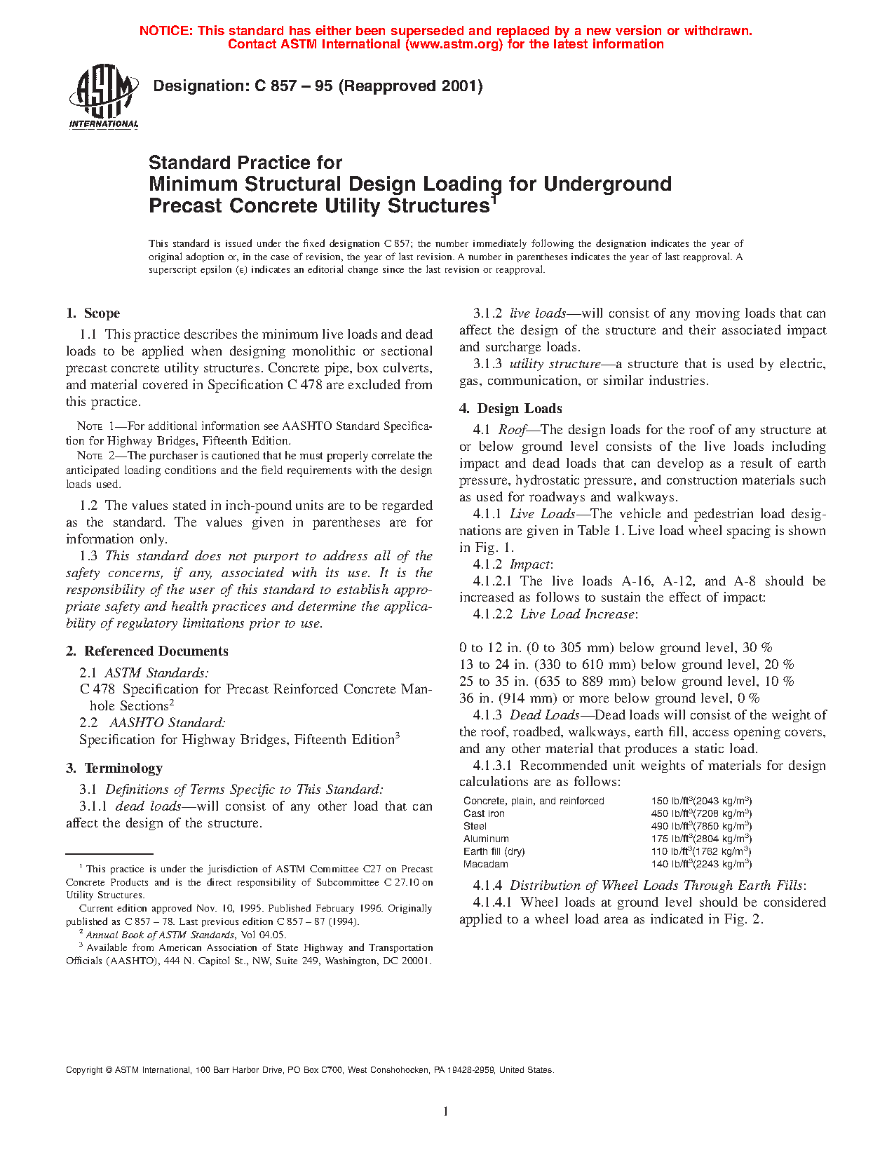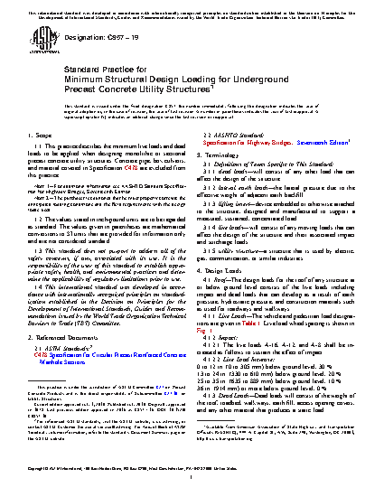 5.1 This practice is intended to standardize the minimum structural design loading for underground precast concrete utility structures.