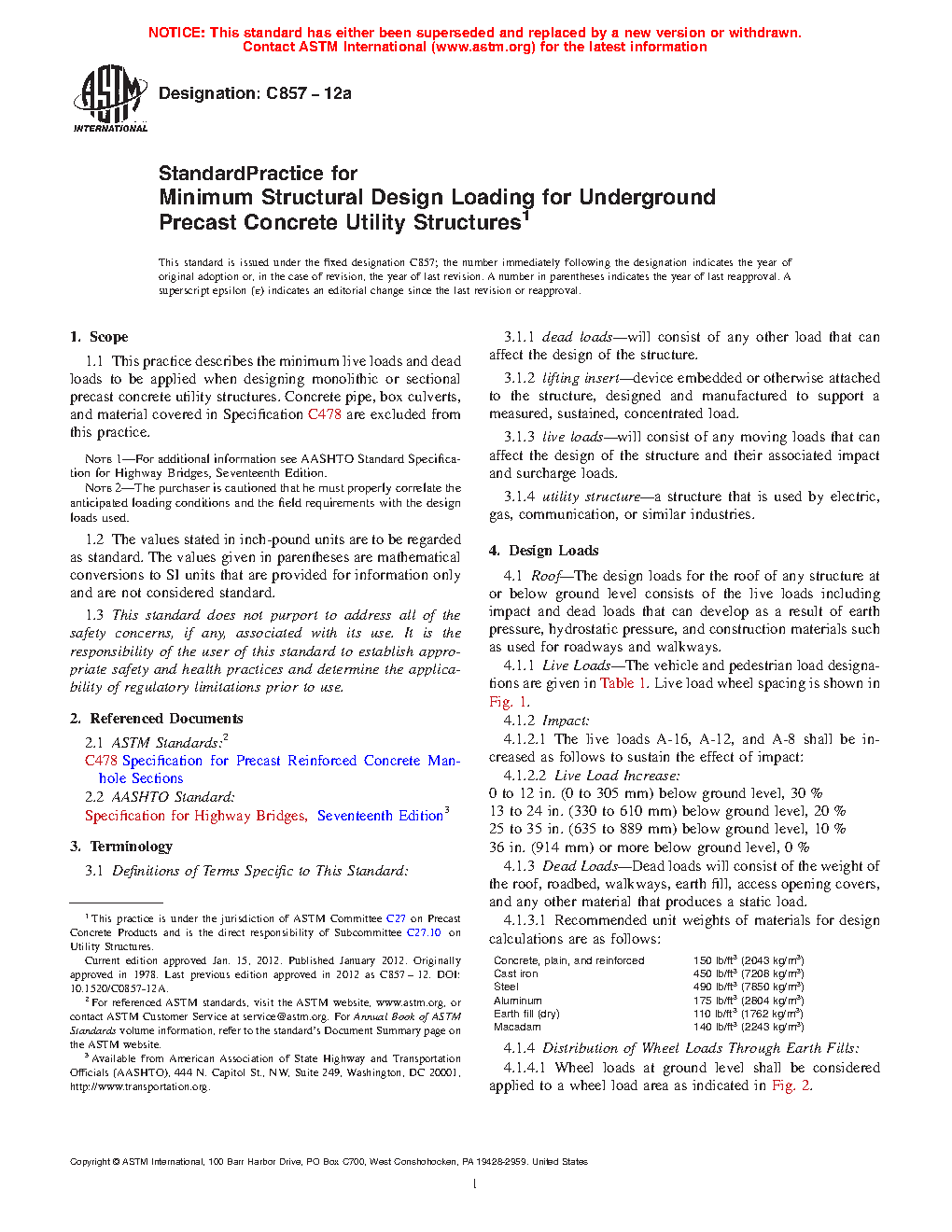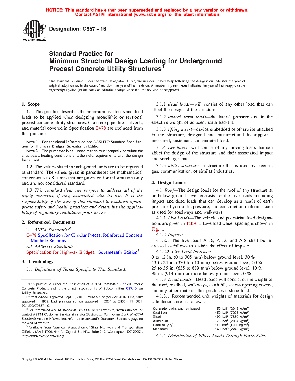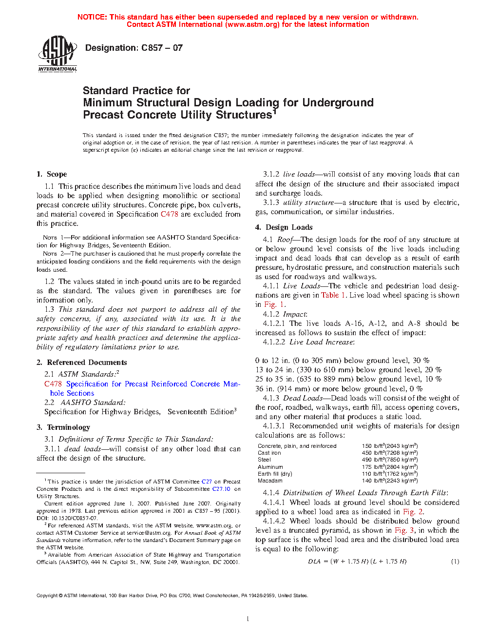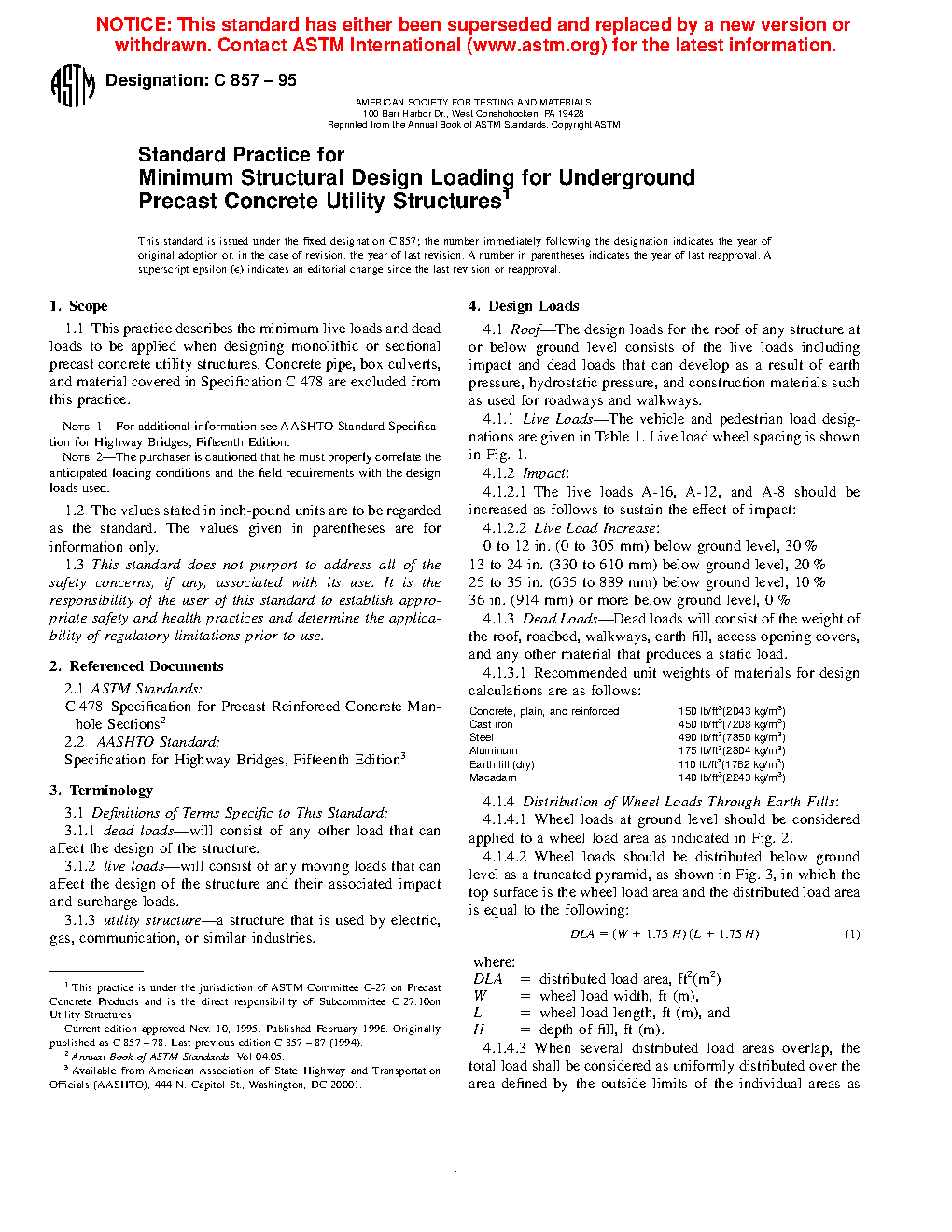 5.1 This practice is intended to standardize the minimum structural design loading for underground precast concrete utility structures.