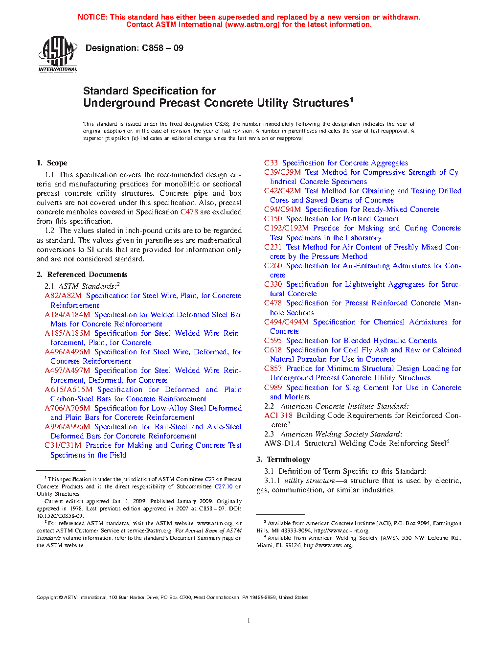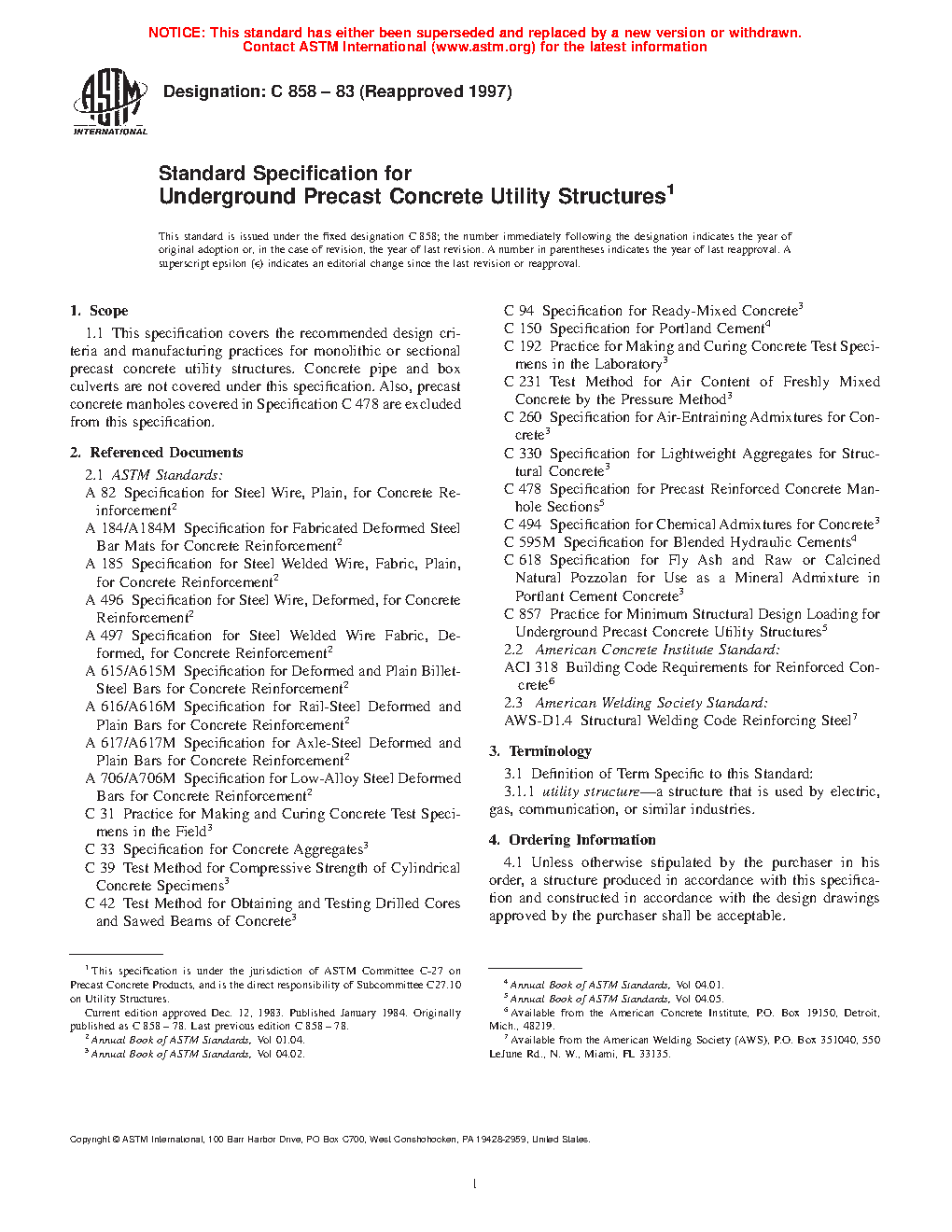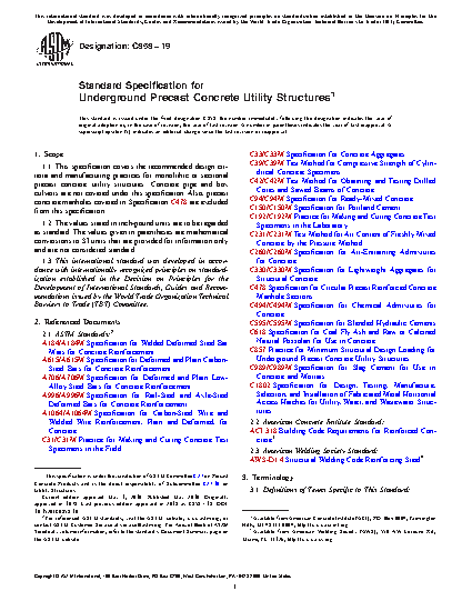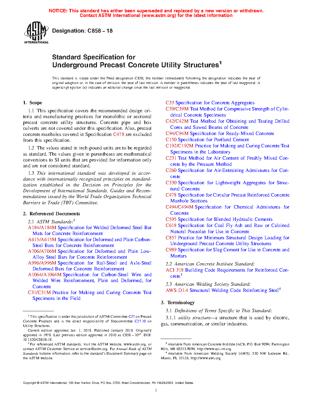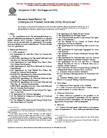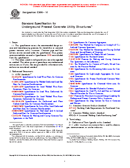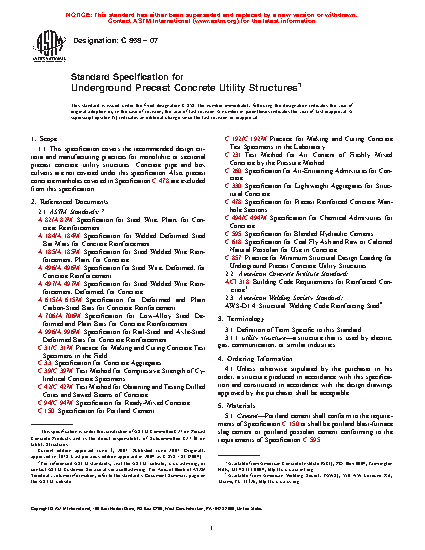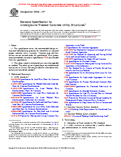 1.1 This specification covers the recommended design criteria and manufacturing practices for monolithic or sectional precast concrete utility structures. Concrete pipe and box culverts are not covered under this specification. Also, precast concrete manholes covered in Specification C478 are excluded from this specification.