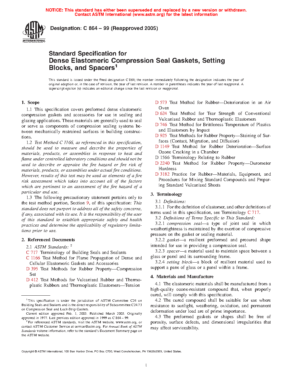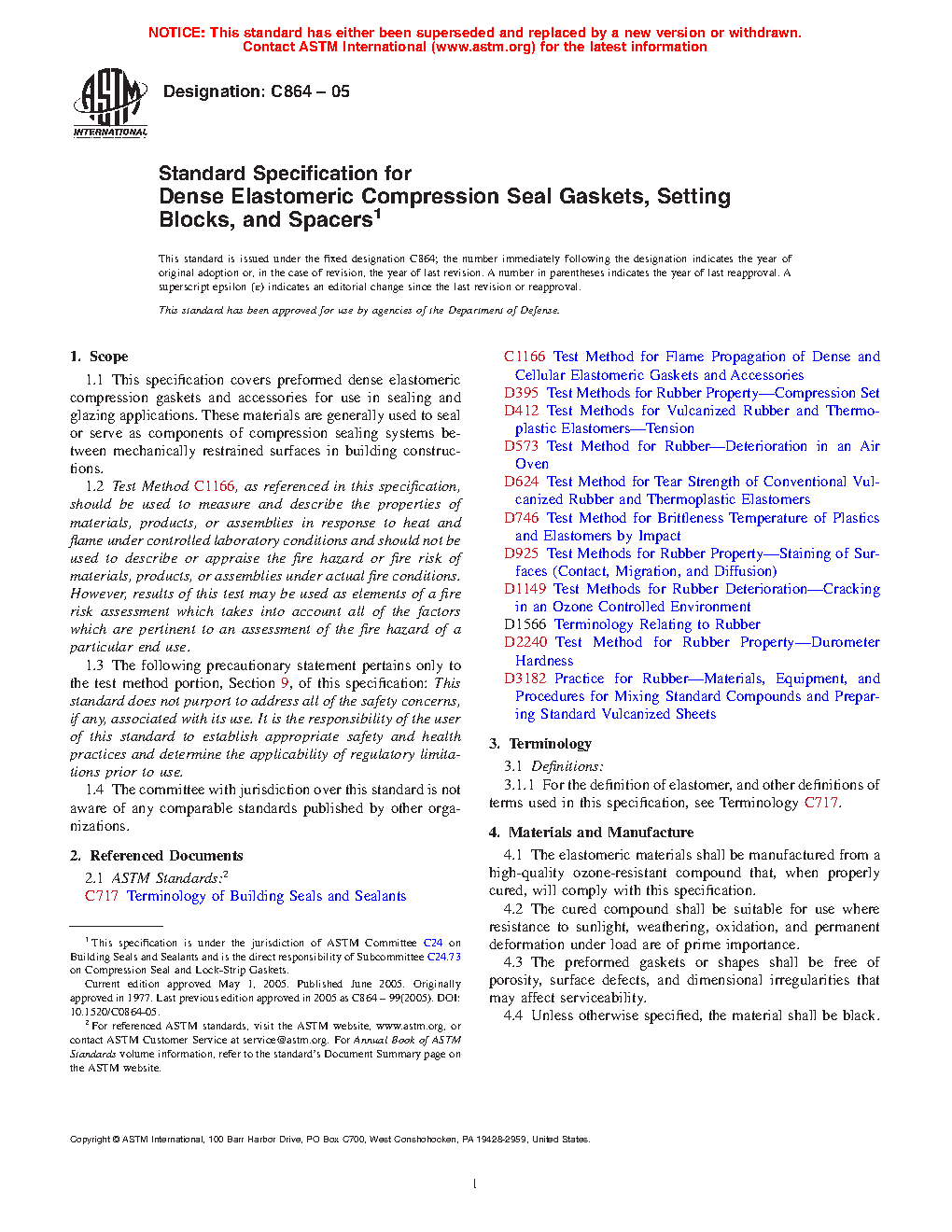 1.1 This specification covers preformed dense elastomeric compression gaskets and accessories for use in sealing and glazing applications. These materials are generally used to seal or serve as components of compression sealing systems between mechanically restrained surfaces in building constructions.