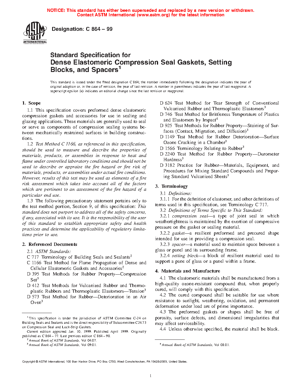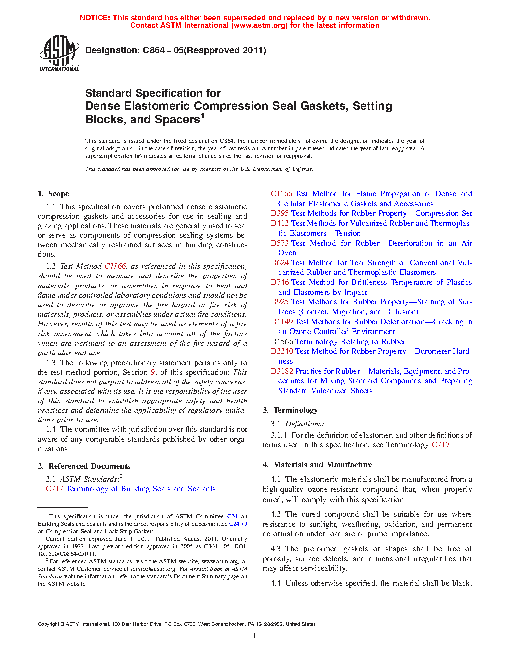 This specification covers preformed dense elastomeric compression gaskets and accessories for use in sealing and glazing applications. These materials are generally used to seal or serve as components of compression sealing systems between mechanically restrained surfaces in building constructions. The elastomeric materials shall be manufactured from a high-quality ozone-resistant compound that, when properly cured, will comply to the requirements specified. The cured compound shall be suitable for use where resistance to sunlight, weathering, oxidation, and permanent deformation under load are of prime importance. The preformed gaskets or shapes shall be free of porosity, surface defects, and dimensional irregularities that may affect serviceability. The specimens shall be subjected to the following test methods: hardness test, compression set test, ozone resistance test, tensile strength test, elongation test, heat aging test, tear strength test, brittleness temperature test, non-staining test, and flame propagation test.