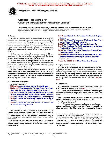 1.1 This test method covers a procedure for evaluating the chemical resistance of a polymer-based protective lining in immersion service. The method closely approximates the service conditions, including the temperature differential between the external and internal surfaces of the equipment, which may accelerate permeation of the lining by a corrosive media.