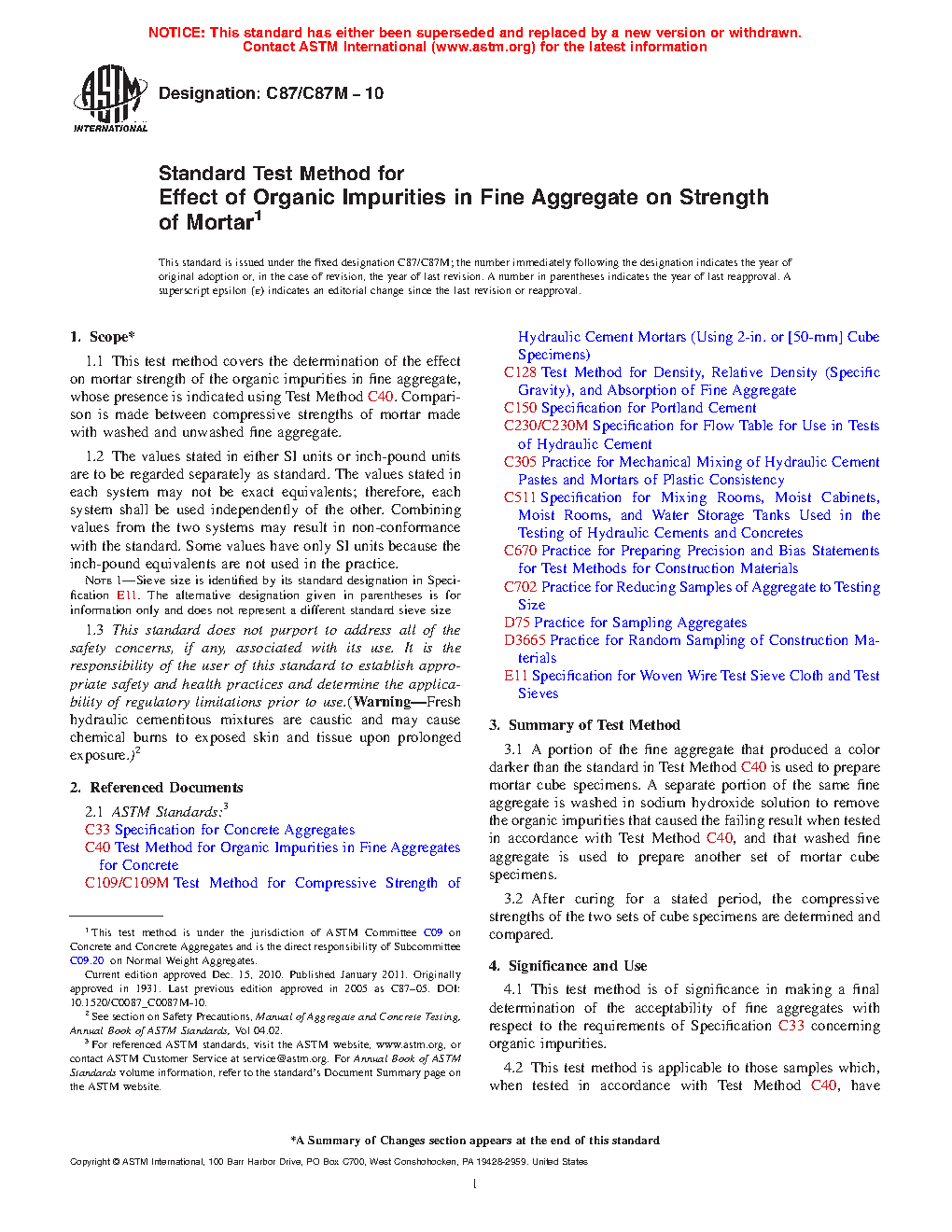 5.1 This test method is of significance in making a final determination of the acceptability of fine aggregates with respect to the requirements of Specification C33/C33M concerning organic impurities.