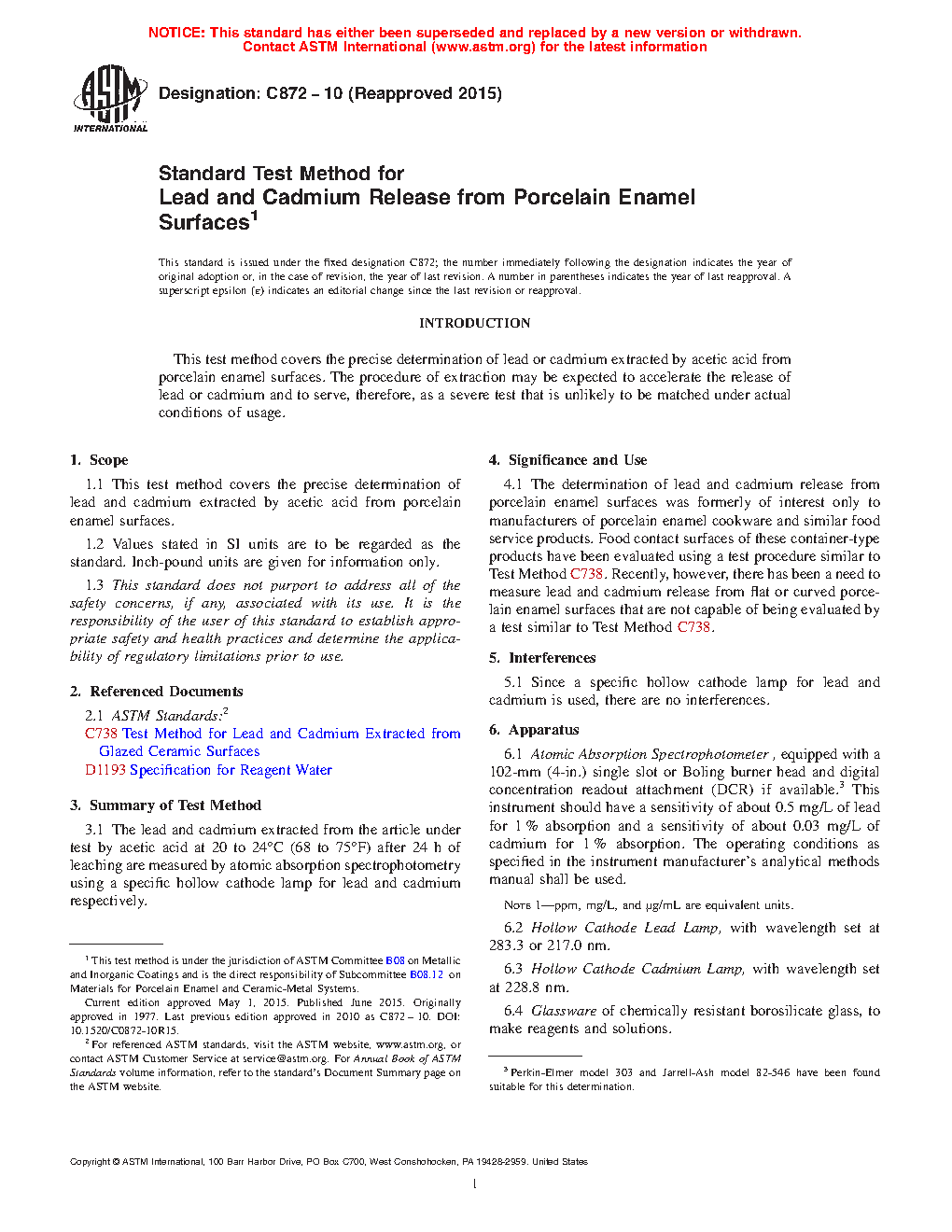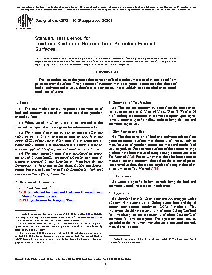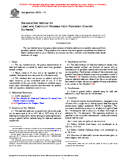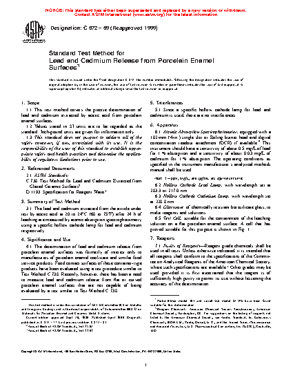 The determination of lead and cadmium release from porcelain enamel surfaces was formerly of interest only to manufacturers of porcelain enamel cookware and similar food service products. Food contact surfaces of these container-type products have been evaluated using a test procedure similar to Test Method C738. Recently, however, there has been a need to measure lead and cadmium release from flat or curved porcelain enamel surfaces that are not capable of being evaluated by a test similar to Test Method C738.