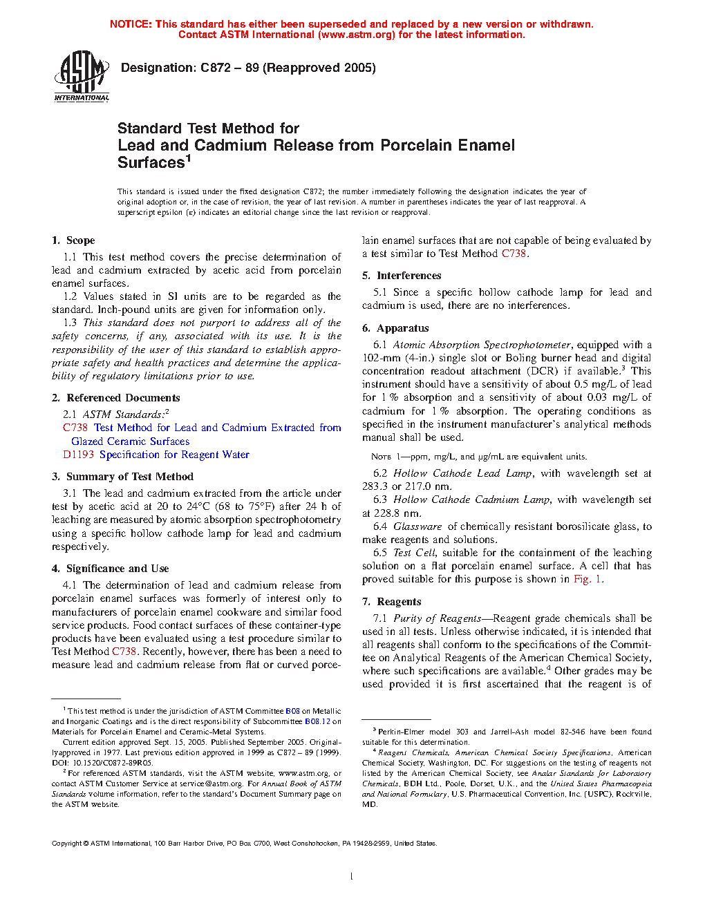 1.1 This test method covers the precise determination of lead and cadmium extracted by acetic acid from porcelain enamel surfaces.