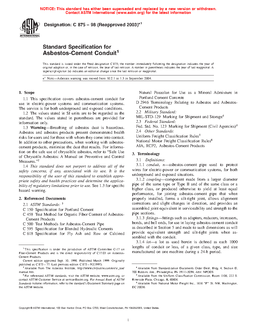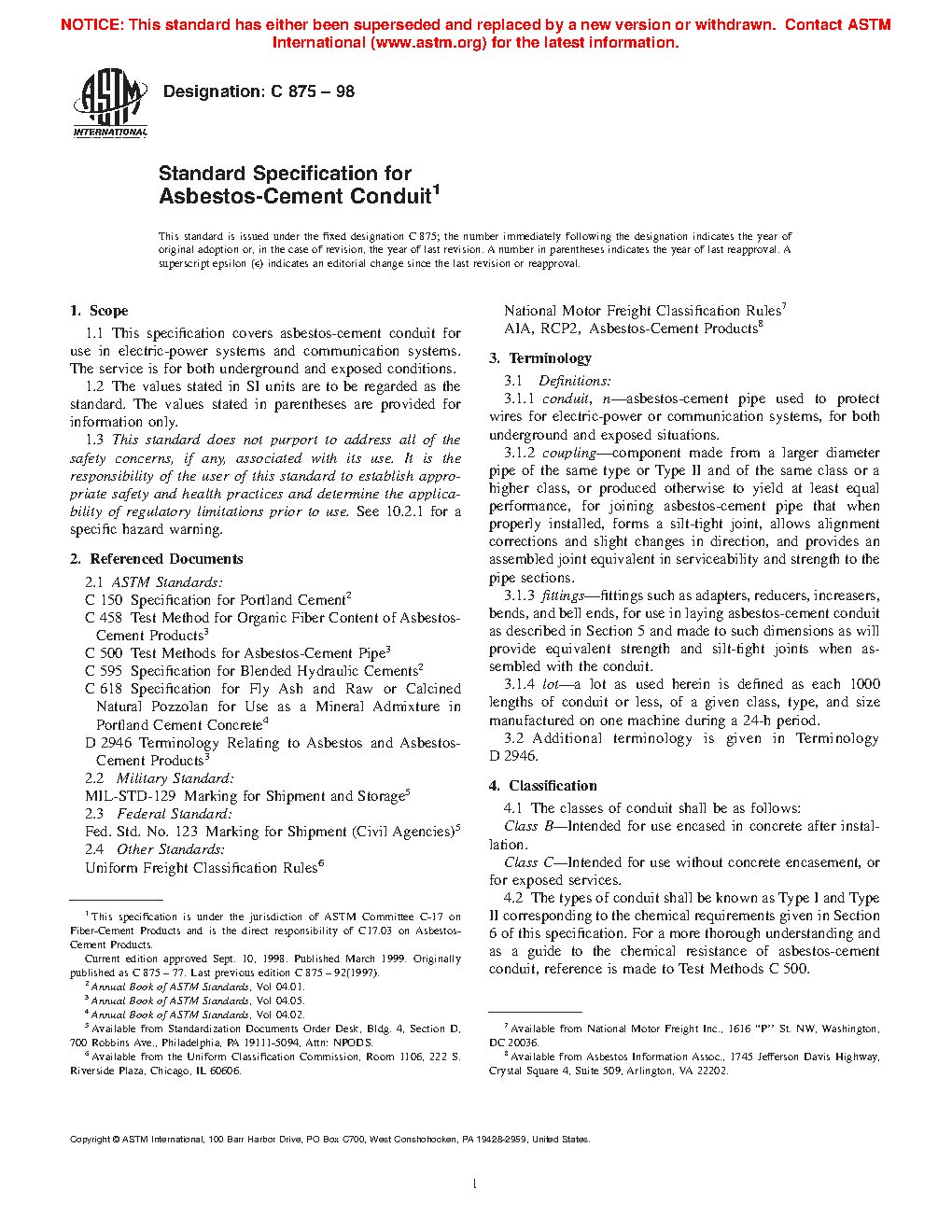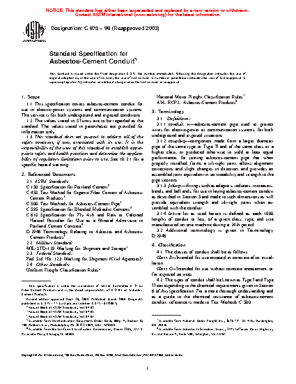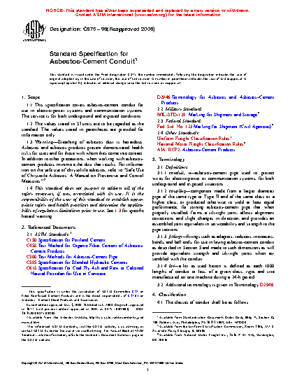 This specification covers asbestos-cement conduit for use in electric-power systems and communication systems, serviced in both underground and exposed conditions. The classes of conduit shall be as follows: Class B, intended for use encased in concrete after installation; and Class C, intended for use without concrete encasement, or for exposed services. The conduits shall also be classified into two types (I and II) according to uncombined calcium hydroxide content. Materials shall conform to specified mechanical requirements such as flexural strength and crushing strength.
