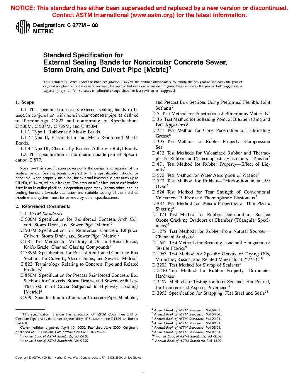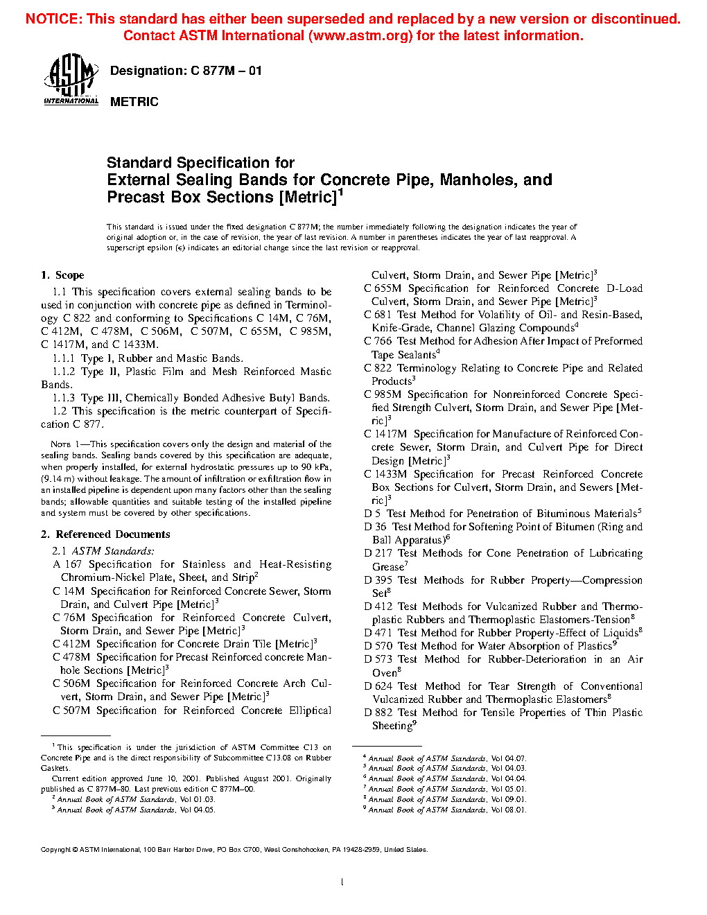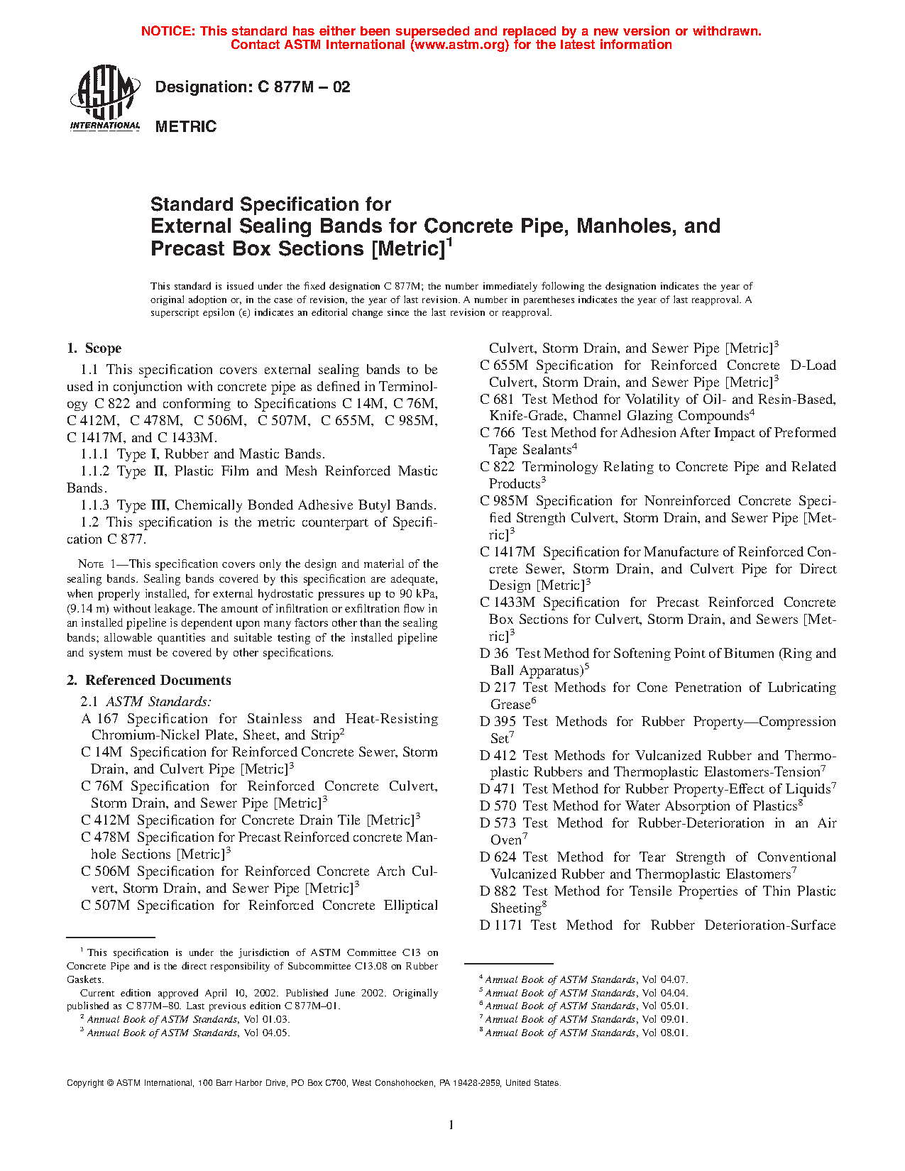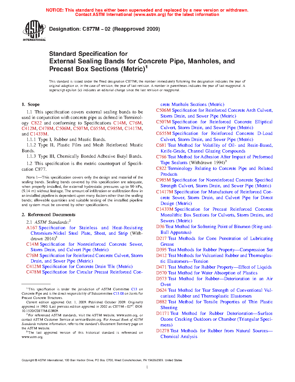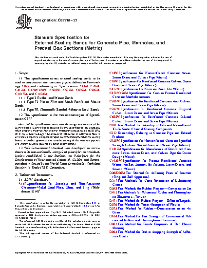 This specification deals with the metric standard for three types of external sealing bands to be used in conjunction with concrete pipe, manholes, and precast box sections. The first type of bands shall be composed of rubber, mastic, and protective film elements, while the second type shall consist of a plastic film, reinforced, rubberized, asphalt, mastic coating with steel straps. The third type shall be composed of a backing band, an applied continuous butyl adhesive coating and an optional release element. All the elements of each type of sealing band shall have physical properties conforming with specified limits as determined through appropriate test methods herein provided.