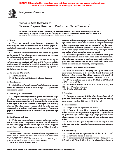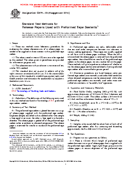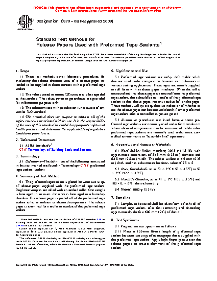 1.1 These test methods cover laboratory procedures for evaluating the release characteristics of a release paper intended to be supplied in direct contact with a preformed tape sealant.