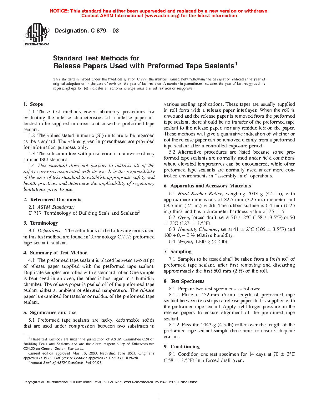 5.2 Alternative procedures are listed because some preformed tape sealants are normally used under field conditions where elevated temperatures can be encountered, while other preformed tape sealants are normally used under more controlled environments in “assembly line” operations.