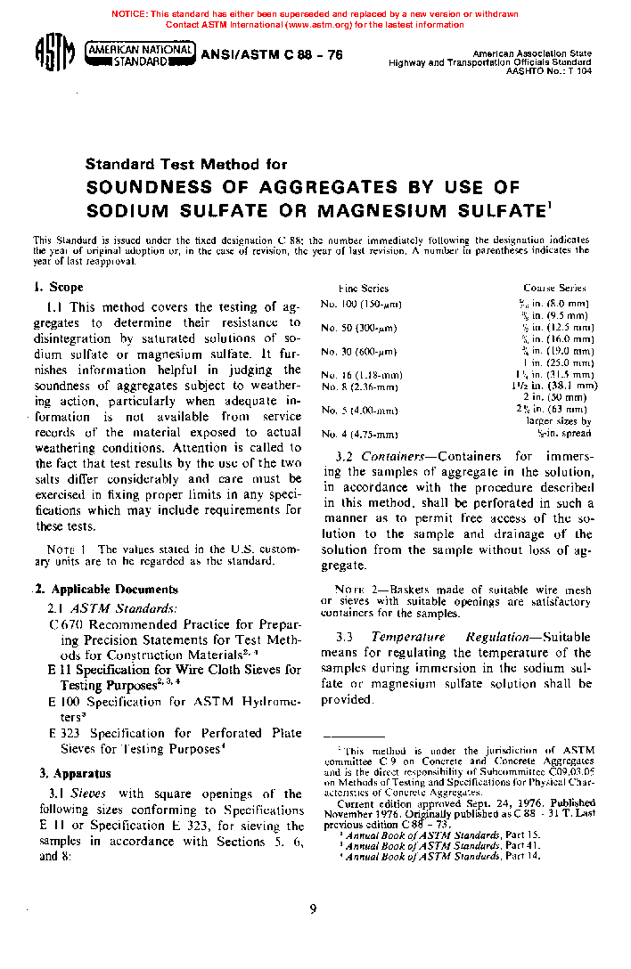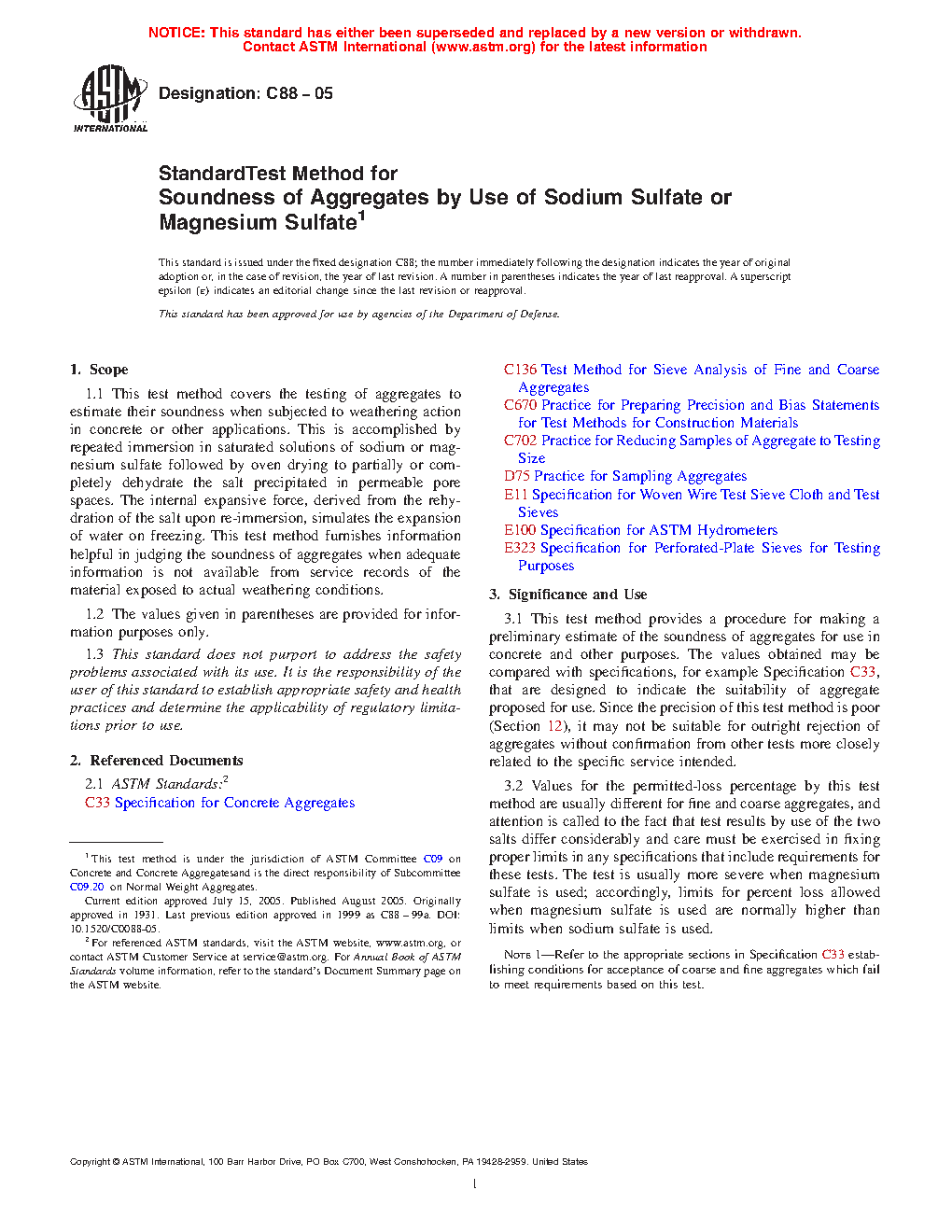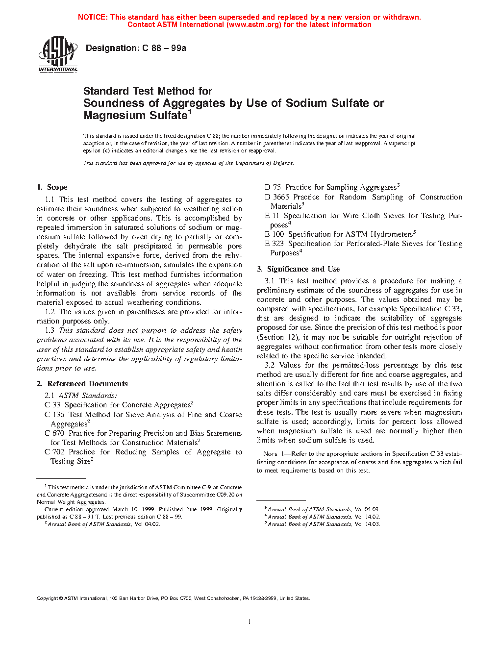 3.1 This test method provides a procedure for making a preliminary estimate of the soundness of aggregates for use in concrete and other purposes. The values obtained may be compared with specifications, for example Specification C33, that are designed to indicate the suitability of aggregate proposed for use. Since the precision of this test method is poor (Section 12), it may not be suitable for outright rejection of aggregates without confirmation from other tests more closely related to the specific service intended.