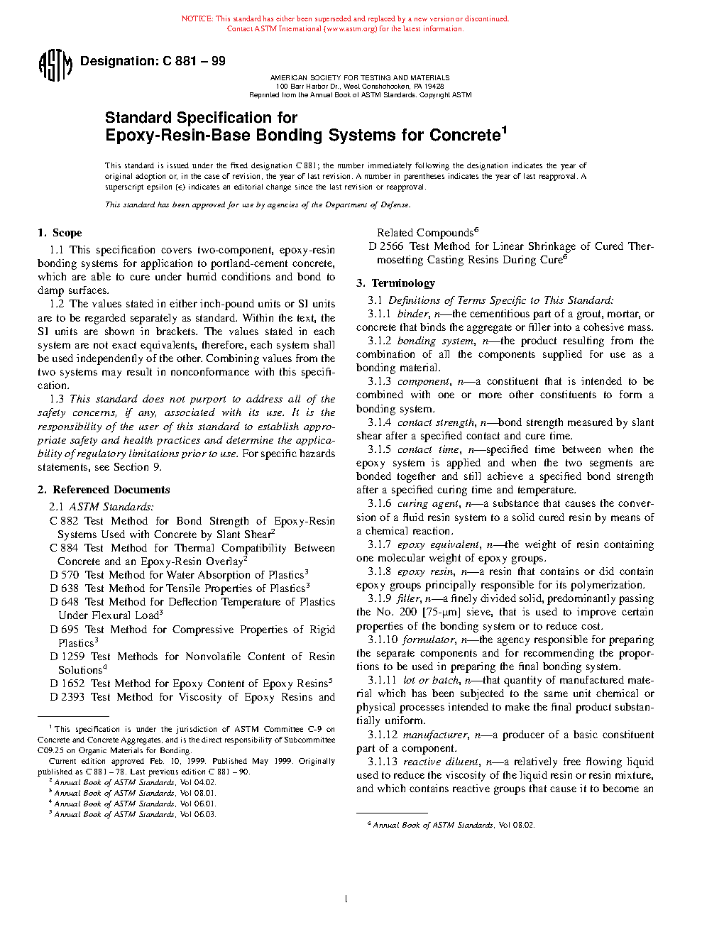 This specification covers two-component, epoxy-resin bonding systems for application to Portland-cement concrete, which are able to cure under humid conditions and bond to damp surfaces. The epoxy-resin bonding systems are classified according to type, grade, class, and color. The bonding systems can be classified as Type I, Type II, Type III, Type IV, Type V, Type VI, and Type VII according to their physical requirements. According to their flow characteristics and viscosity, the bonding systems can be classified as Grade 1, Grade 2, and Grade 3. Also, in accordance with the range of temperatures for which they are suitable, these materials can be designated as Class A, Class B, Class C, Class D, Class E, and Class F. Classes A, B, and C are defined for Types I through V, and Classes D, E, and F are defined for Types VI and VII. Epoxy resin systems are normally unpigmented, but they can be colored or darkened. These bonding systems shall be furnished in two components for combining immediately prior to use in accordance with written instructions formulated Component A shall contain an epoxy resin with or without a reactive diluent. Component B shall contain one or more curing agents, which on mixing with Component A shall cause the mixture to harden. A suitable inert filler may be uniformly incorporated in one or both components. The filler shall be either nonsettling or readily dispersible in any component in which it is incorporated. All systems shall cure under humid conditions, and bond to damp surfaces. Different test methods shall be performed to determine the following properties: consistency, gel time, filler content, epoxy equivalent, viscosity, absorption, bond strength, thermal compatibility, heat deflection temperature, linear coefficient of shrinkage, compressive yield strength and modulus, tensile strength and elongation at break, and contact strength.