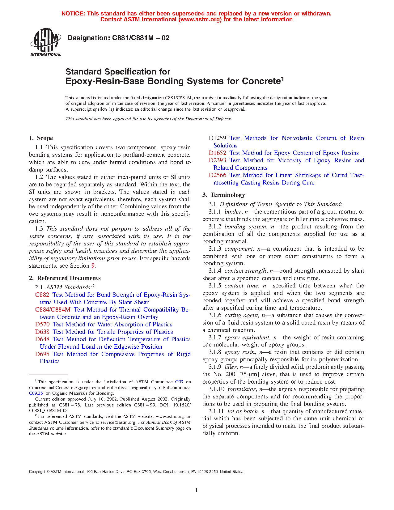 1.2 This specification does not cover epoxy-resin-base bonding systems that have been modified by addition of components such as cement, fine aggregate, or fiber reinforcement. Additional testing may be required to meet applicable specifications for these applications.