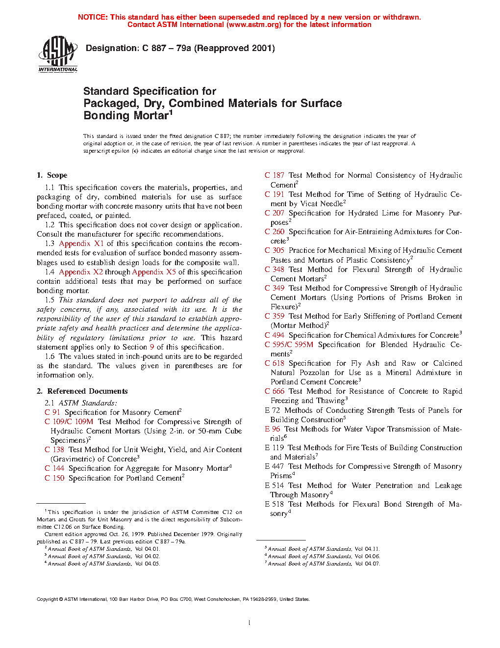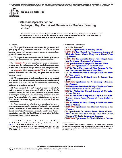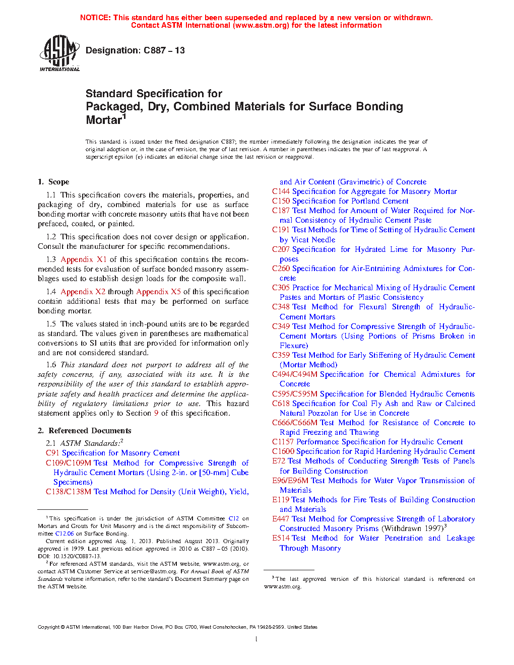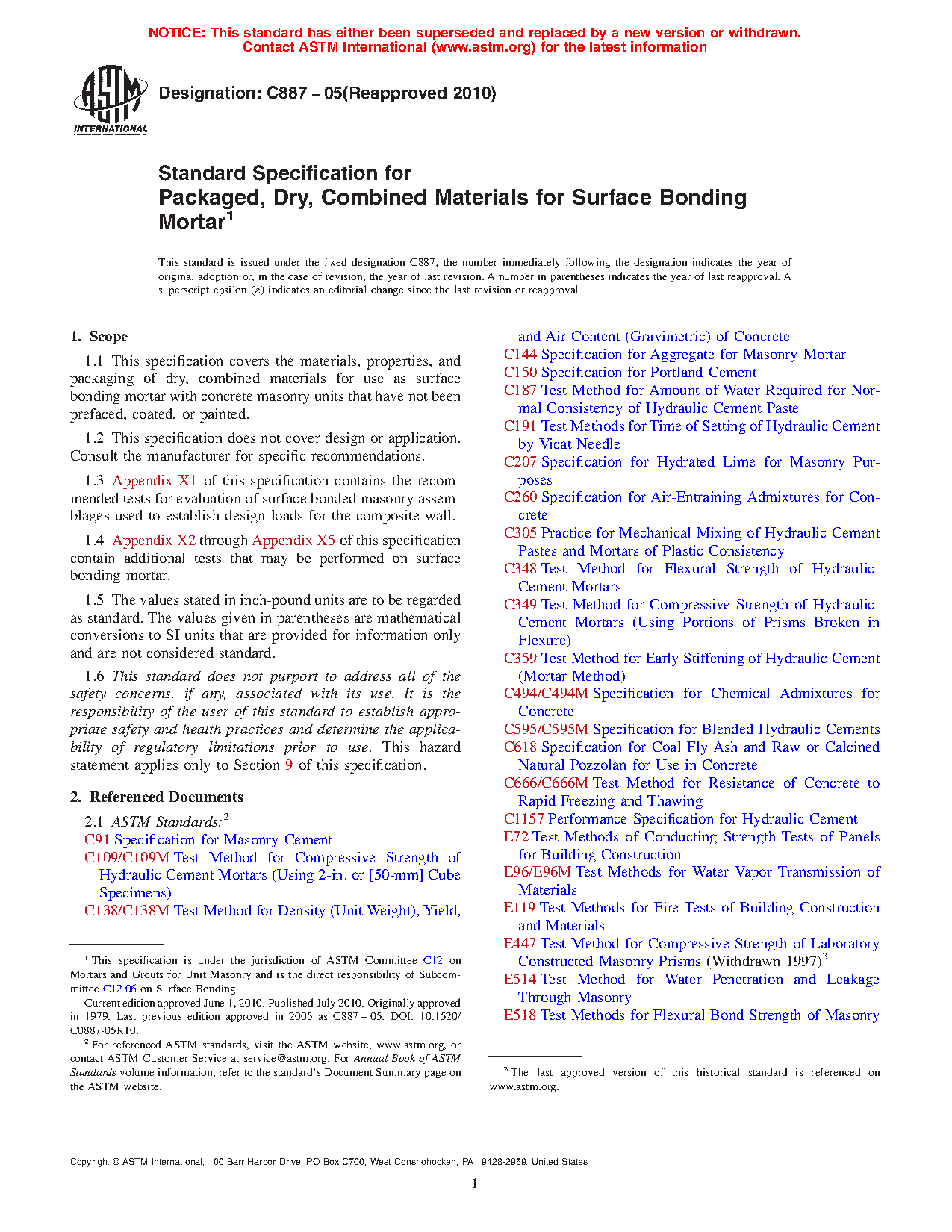 1.1 This specification covers the materials, properties, and packaging of dry, combined materials for use as surface bonding mortar with concrete masonry units that have not been prefaced, coated, or painted.