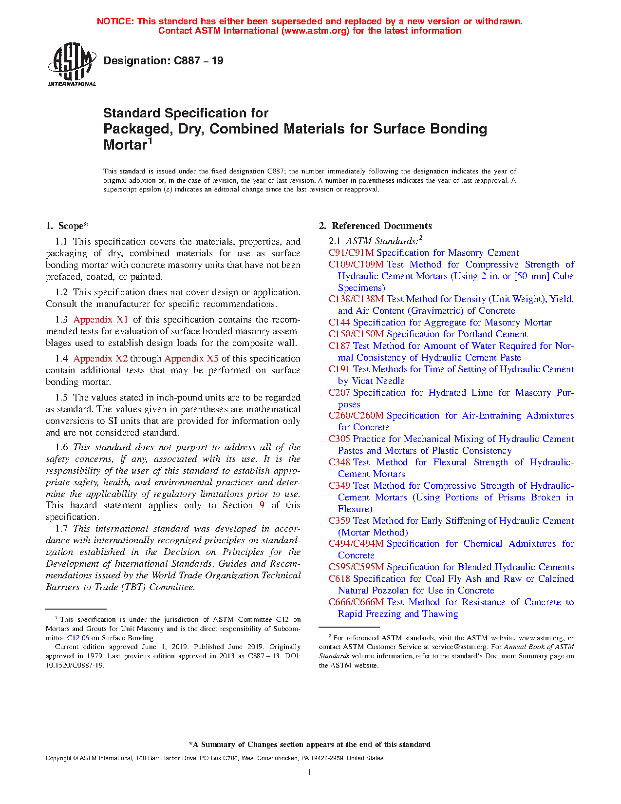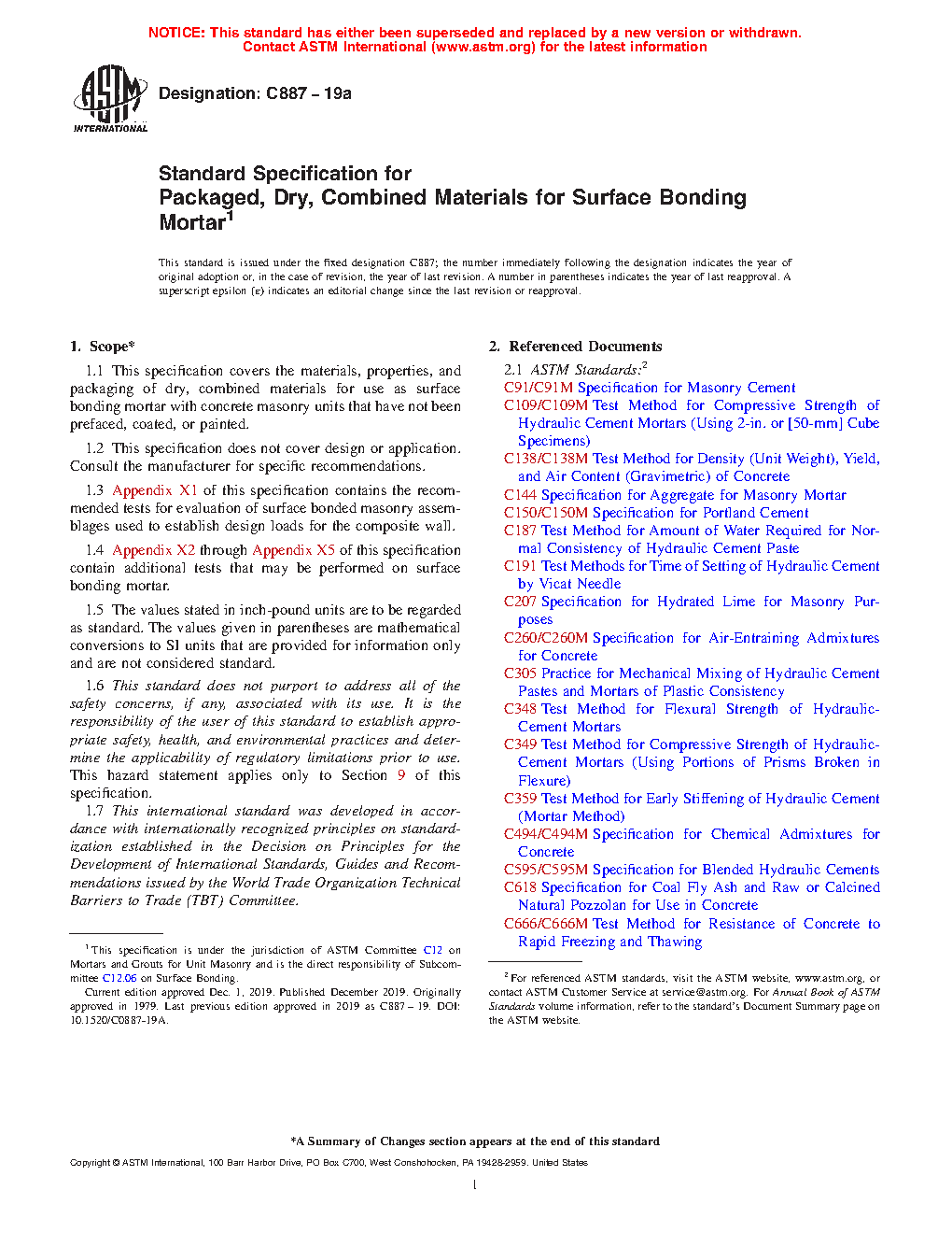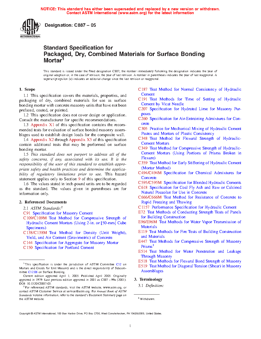 1.1 This specification covers the materials, properties, and packaging of dry, combined materials for use as surface bonding mortar with concrete masonry units that have not been prefaced, coated, or painted.