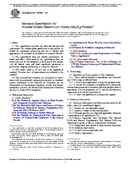 This specification provides chemical and physical requirements for nuclear-grade gadolinium oxide powder intended for subsequent processing and use in nuclear fuel applications. Chemical requirements of the specification include loss-on-ignition, gadolinium oxide concentration, and impurity content limits. The buyer shall specify the particle size, density, shape factor, and crystal structure. Gadolinium oxide powder shall be packaged in sealed containers.