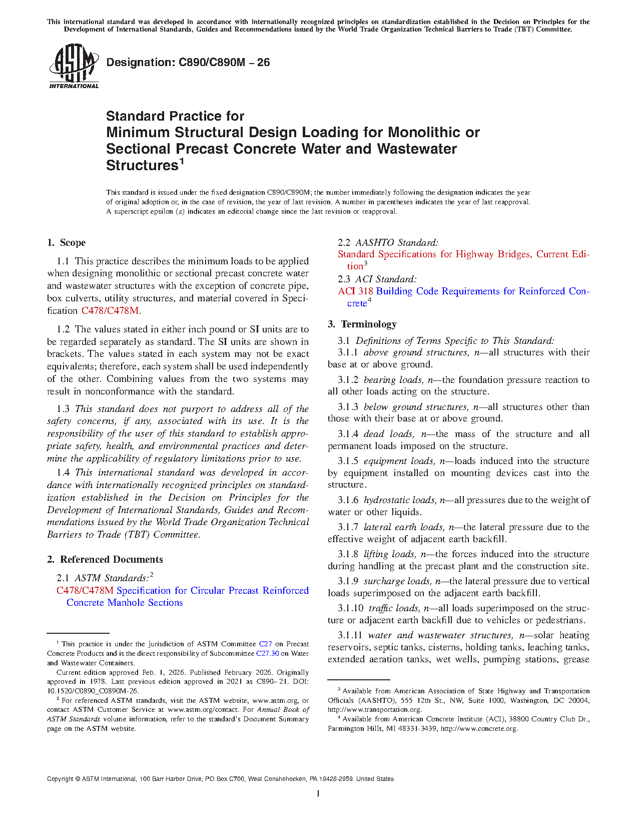 1.1 This practice describes the minimum loads to be applied when designing monolithic or sectional precast concrete water and wastewater structures with the exception of concrete pipe, box culverts, utility structures, and material covered in Specification C478/C478M.