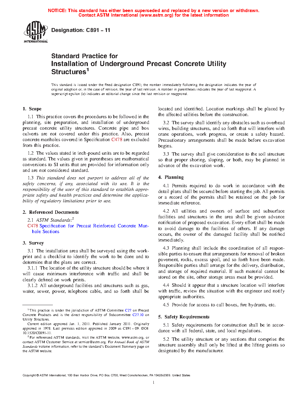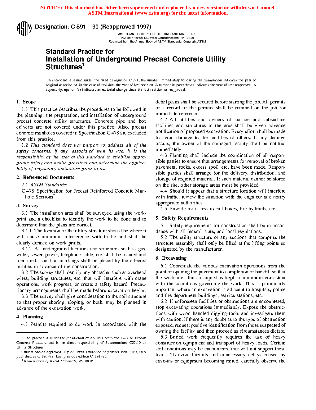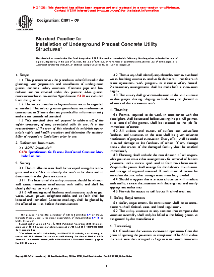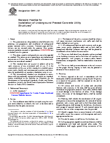 1.1 This practice covers the procedures to be followed in the planning, site preparation, and installation of underground precast concrete utility structures. Concrete pipe and box culverts are not covered under this practice. Also, precast concrete manholes covered in Specification C478/C478M are excluded from this practice.