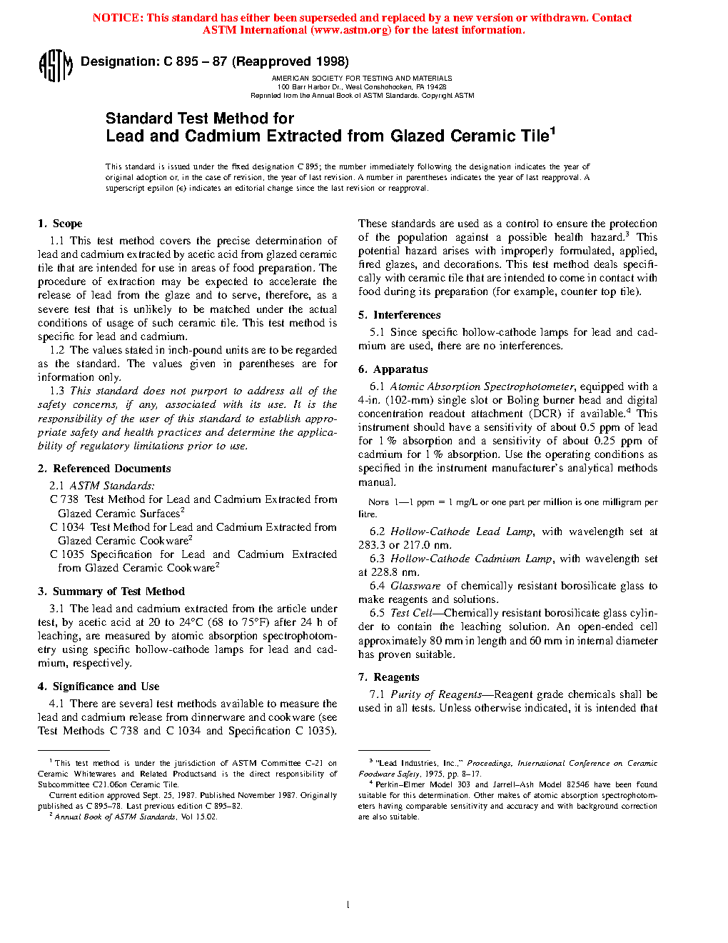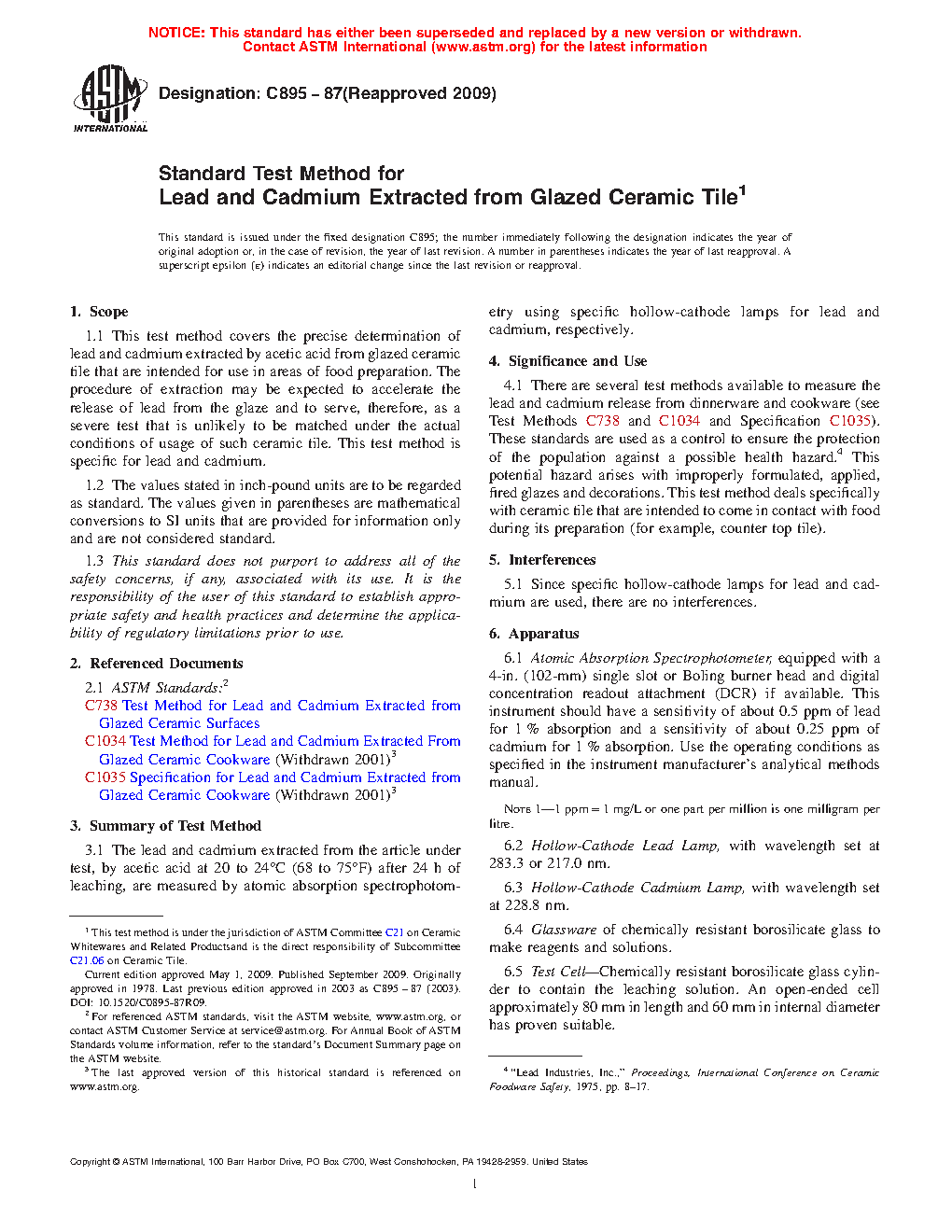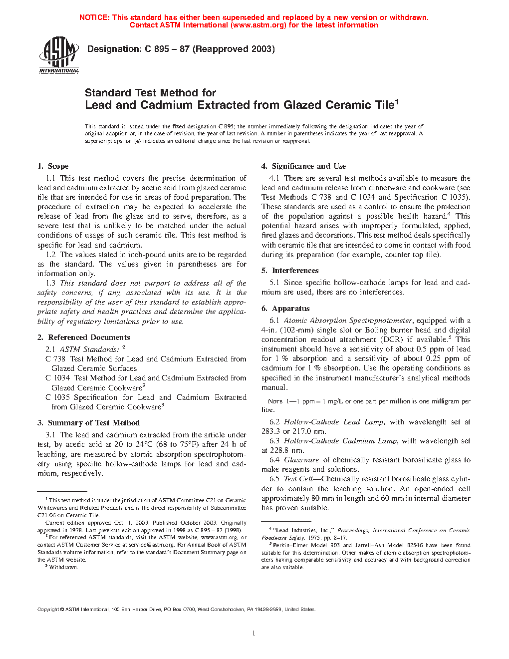 4.1 There are several test methods available to measure the lead and cadmium release from dinnerware and cookware (see Test Methods C738 and C1034 and Specification C1035). These standards are used as a control to ensure the protection of the population against a possible health hazard.4 This potential hazard arises with improperly formulated, applied, fired glazes and decorations. This test method deals specifically with ceramic tile that are intended to come in contact with food during its preparation (for example, counter top tile).