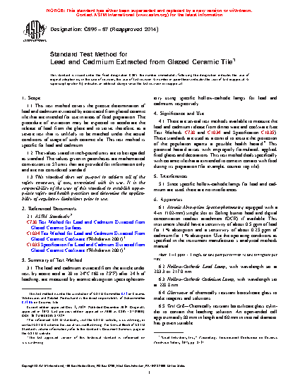 1.1 This test method covers the precise determination of lead and cadmium extracted by acetic acid from glazed ceramic tile that are intended for use in areas of food preparation. The procedure of extraction may be expected to accelerate the release of lead from the glaze and to serve, therefore, as a severe test that is unlikely to be matched under the actual conditions of usage of such ceramic tile. This test method is specific for lead and cadmium.